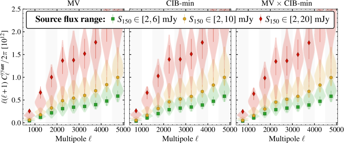 Power spectra of the difference maps ﹩{C}_{\ell }^{y{y}_{{\bf{diff}}}}﹩ computed by subtracting the baseline case of S150 = 2 mJy from the maps made with other source masking schemes: S150 = 6 mJy (green), S150 = 10 mJy (yellow), and S150 = 20 mJy (red). The violins show the scatter from simulations, which include both the statistical and the systematic errors from radio sources. The simulations used are CMB + kSZ + tSZ + Uncorr-CIB + Uncorr-radio, and do not contain correlation between tSZ and bright sources. The observed differences are consistent within the errors, which increase significantly with the masking threshold due to the residual radio power, and we do not observe a significant correlation between tSZ and bright point sources detected in our survey footprint.