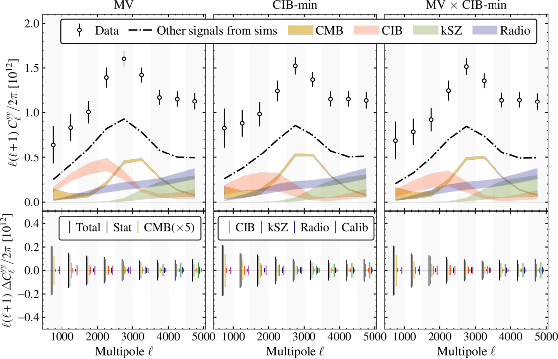 The total measured power spectra from data are shown as open circles in top panels for MV (left), CIB-min (middle), and the cross spectrum between the two (right). The dashed–dotted line corresponds to the expectation spectra of the undesired components, with the individual contributions shown in different colors: CMB in yellow, CIB in red, kSZ in green, and radio in blue. The dashed–dotted curve does not have the tSZ contribution, so it is not expected to align with the data points. The bands correspond to the systematic scatter in each component (see the Appendix for details). The error budgets (black) are presented in the bottom panels and have been decomposed into statistical (gray) and systematic errors from the undesired signals and calibration uncertainties (all other colors).