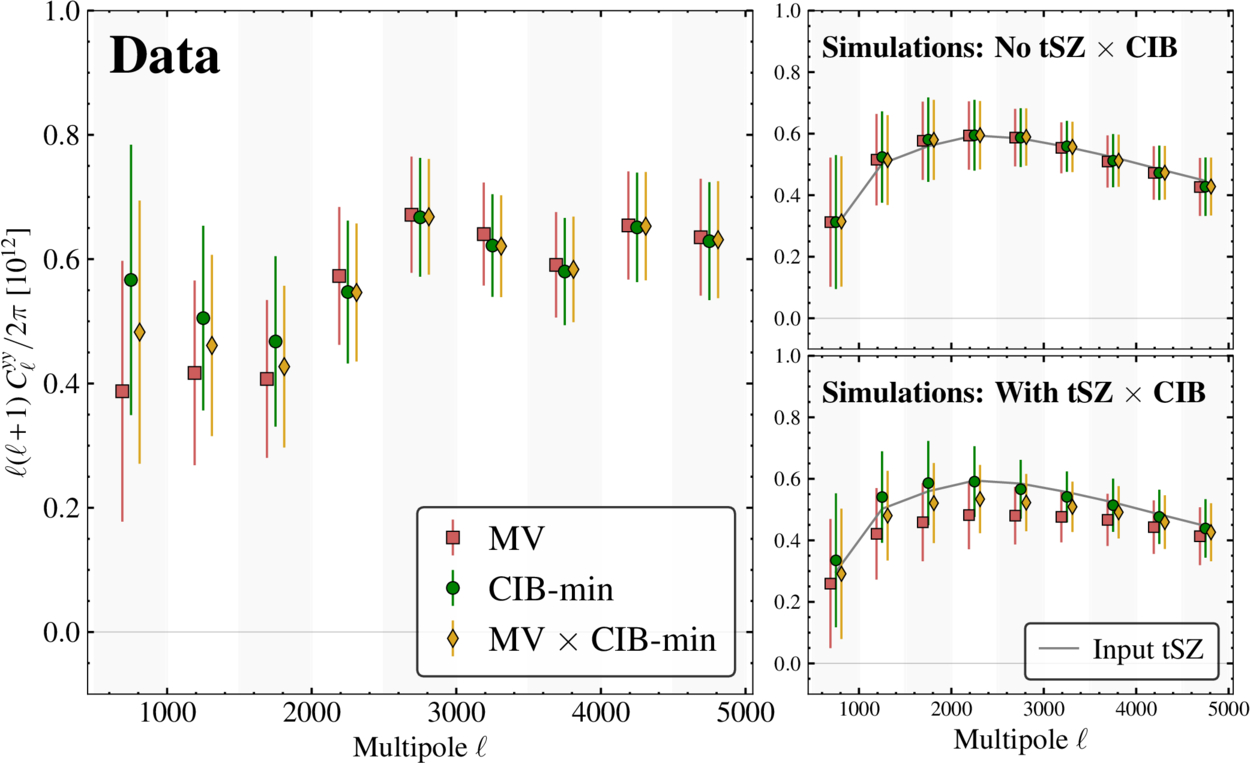 Reconstructed tSZ power spectra measured from data (left) and simulations (right): MV (red squares), CIB-min (green circles), and their cross spectrum (yellow diamonds). Left panel: in data, the tSZ power spectrum is measured at ∼9.3σ in all three cases. At ℓ ≳ 2500, we find excellent agreement between all three spectra. The differences at lower multipoles are due to the different levels of tSZ × CIB, which results in a partial cancellation of the recovered tSZ signal. Right panels: The input tSZ power spectrum in the simulations is shown as the solid gray curve. The top-right panel corresponds to AGORA simulations with all the components but after explicitly removing the tSZ × CIB using (CMB + kSZ + tSZ + Uncorr-CIB + Uncorr-radio). In the absence of tSZ × CIB, all of the estimators return unbiased results. The bottom-right panel contains tSZ × CIB, and in this case, we find the MV estimate to be biased low at large scales. The CIB-min remains unbiased, and MV × CIB-min lies in between the two. The simulation’s results are obtained after averaging over 25 realizations. This trend is similar between data and simulations, although unlike in the empirical data, the simulations show that MV remains biased even at small scales. This is due to the differences in tSZ × CIB between data and simulations. The bottom-right panel is provided solely for illustration to build intuition about how the tSZ × CIB can bias the tSZ power spectrum, and we emphasize that we do not rely on tSZ × CIB in simulations for any part of our analysis.