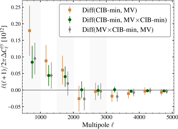 The difference spectrum ﹩{\rm{\Delta }}{C}_{{\ell }_{XY}}^{yy}﹩ computed from different LC combinations are shown. The difference spectrum should be consistent with zero in the absence of any bias, and we attribute the differences to the residual CIB bias arising due to tSZ × CIB. The error bars are computed using the square root of the diagonal of the covariance matrix of the difference spectrum in Equation (4). As is the case for ﹩{C}_{\ell }^{yy}﹩, the adjacent ℓ bins are highly correlated.