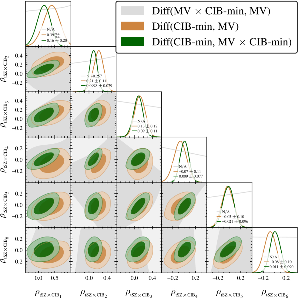 Full corner plot showing the correlations between ﹩{\rho }_{\ell }^{{\rm{tSZ}}}\times {\rm{CIB}}﹩ in the six bins shown in Figure 7. The colors follow the same scheme as Figures 6 and 7. For completeness, we also include in gray the results from the difference test of (MV × CIB-min, MV); however, this test provides no additional constraining power.