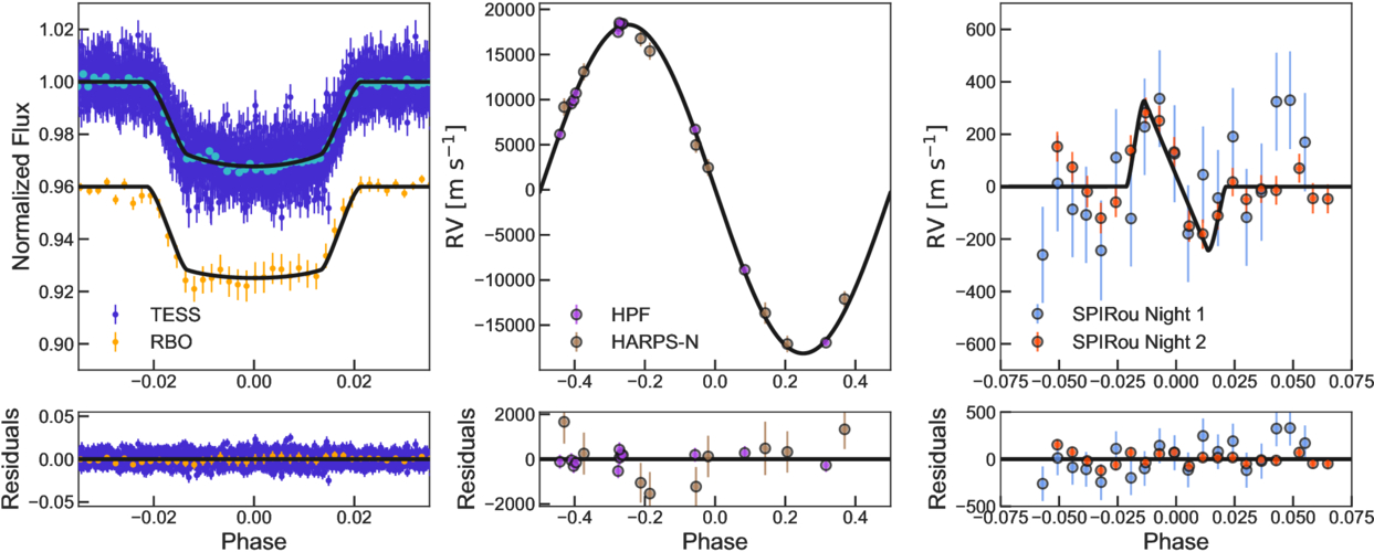 Left panel: the phase-folded TESS and RBO light curves. The light-blue dots are the binned TESS light curve with a binning size of about 180 s. Middle panel: the out-of-transit radial velocities from HPF and HARPS-N. Right panel: the two-night SPIRou RM measurements after subtracting the best Keplerian model. The plotted error bars are the quadrature sums of the uncertainties of individual measurements and the jitters. The best-fit models are shown as black curves in each plot. The residuals are presented in three bottom panels.