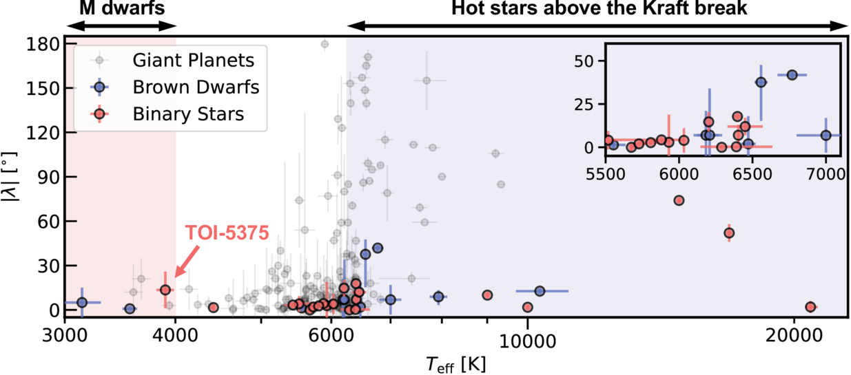 Projected stellar obliquity (λ) of giant planet (0.3 ≤ Mc < 13.6 MJ, gray), brown dwarf (13.6 ≤ Mc < 80 MJ, blue) and binary star (Mc ≥ 80 MJ, red) systems as a function of primary star effective temperature. M dwarfs and hot stars with effective temperatures above the Kraft break (Teff ∼ 6250 K) are shown as red and blue shaded regions, respectively. TOI-5375 is marked with a red arrow. The obliquities of giant planets and brown dwarfs are retrieved from the TEPCat catalog (J. Southworth 2011), while the results of binary stars come from M. L. Marcussen & S. H. Albrecht (2022) and some recent works (T. Wells et al. 2025; B. Spejcher et al. 2026, 2025).
