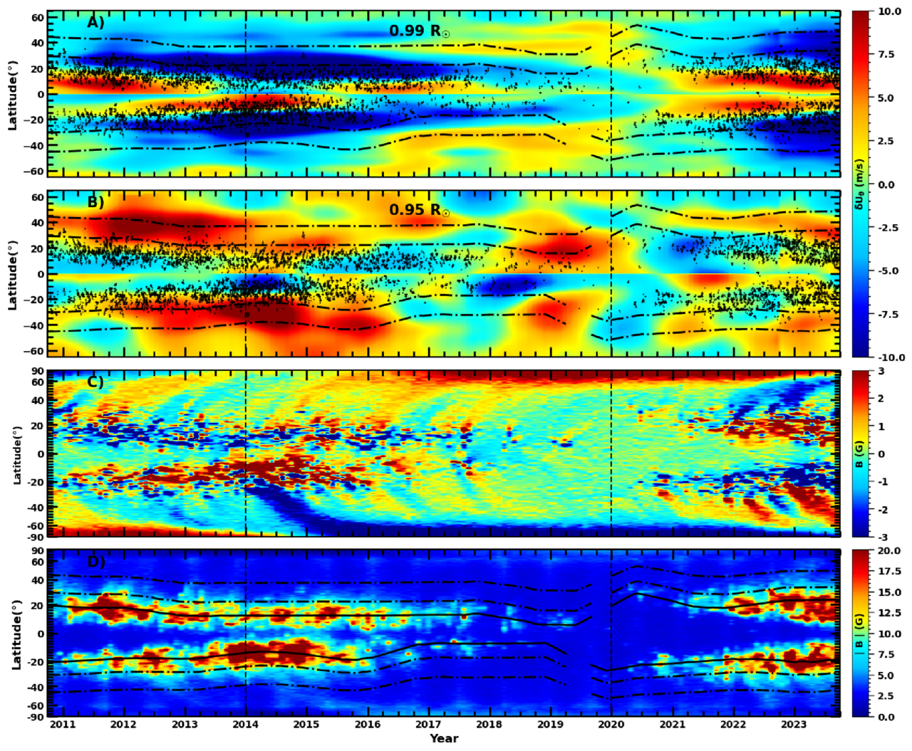 Time–latitude profile of variations in the residual meridional flow at two depths, 0.99R⊙ and 0.95R⊙, respectively, are in panels (A) and (B). Positive values correspond to poleward flow in both hemispheres. Corresponding time–latitude variations in the longitudinally averaged signed (i.e., the magnetic butterfly diagram) and unsigned magnetic field are in the lower panels (C) and (D), respectively. The solid line overplotted in panel (D) marks the mean latitude, θm, of peak magnetic flux in each hemisphere, and the dotted–dashed lines in panels (A), (B), and (D) enclose the region 10°– 25° away from θm. The two vertical dotted lines mark epochs of solar cycle 24 maximum (2014) and minimum (2020). Sunspot locations are overplotted as black dots.