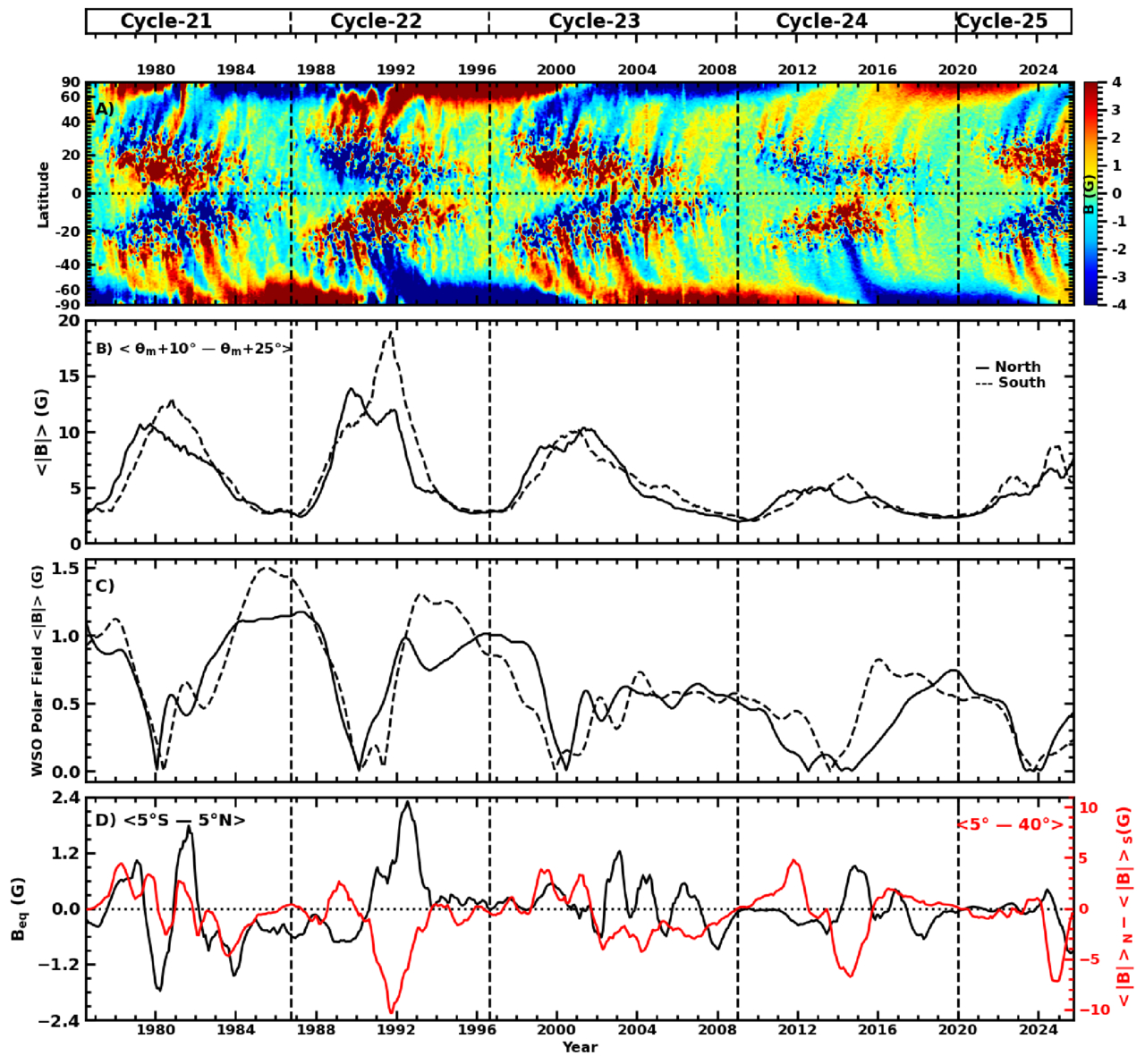 Panel (A) shows the temporal and latitudinal evolution of the longitudinally averaged signed magnetic field from solar cycle 21 to the early phase of cycle 25, based on NSO Kitt Peak, SOLIS, and HMI synoptic magnetograms. Panel (B) shows the unsigned magnetic field (∣B∣) averaged over 10°–25° away from the mean latitude, θm, of peak magnetic flux in each hemisphere, while panel (C) shows the unsigned polar field from WSO measurements. In panel (D), the black solid curve is the north–south average of signed magnetic field intensity within 5°S-5°N (left y-axis), Beq, that represents the cross-equatorial flux plumes, while the red curve is the hemispheric asymmetry of active-region magnetic field, Basym, calculated as the difference between the absolute magnetic field averaged over active latitudes (5∘–40∘) in the north and south.