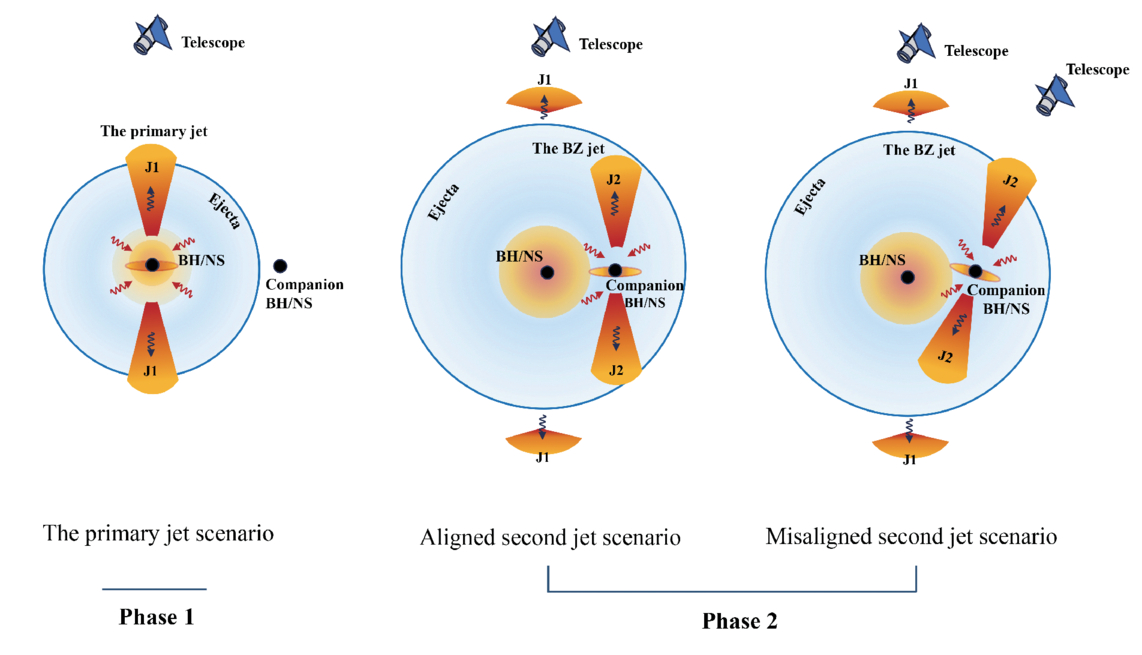 Schematic illustration of the two-jet scenario. Phase I: the primary jet J1 produces prompt gamma-ray emission. Phase II: the second jet J2 is launched after a time delay (Δt). For aligned jets (left), the relative speed determines whether J2 collides violently (Γ2 > Γ1) or merges gradually (Γ2 < Γ1). For misaligned jets (right), the line of sight determines the observed signal: a normal GRB with late-time radio lobes if aligned with J1, or a fast X-ray transient followed by off-axis rebrightening if aligned with J2.