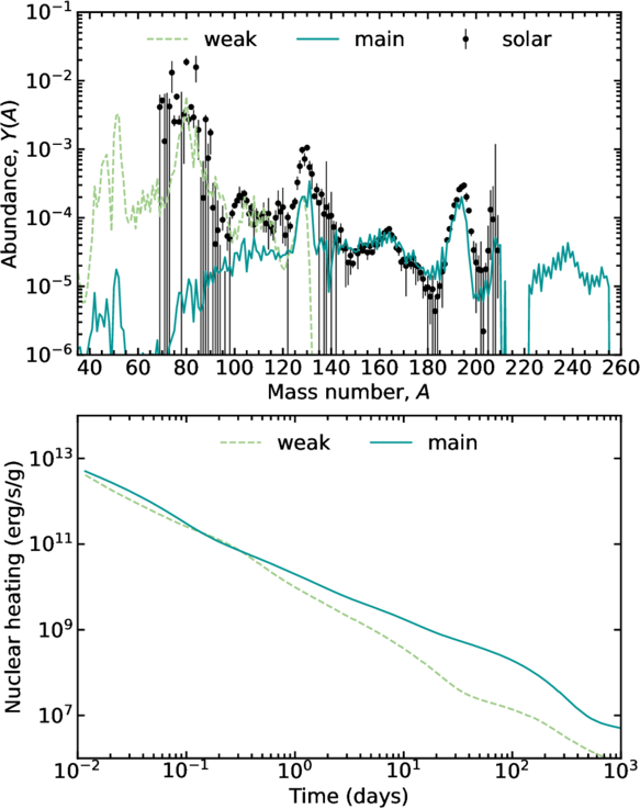 Composition (at 1 day) and heating in collapsar nucleosynthesis, illustrating both weak and main r-processes.