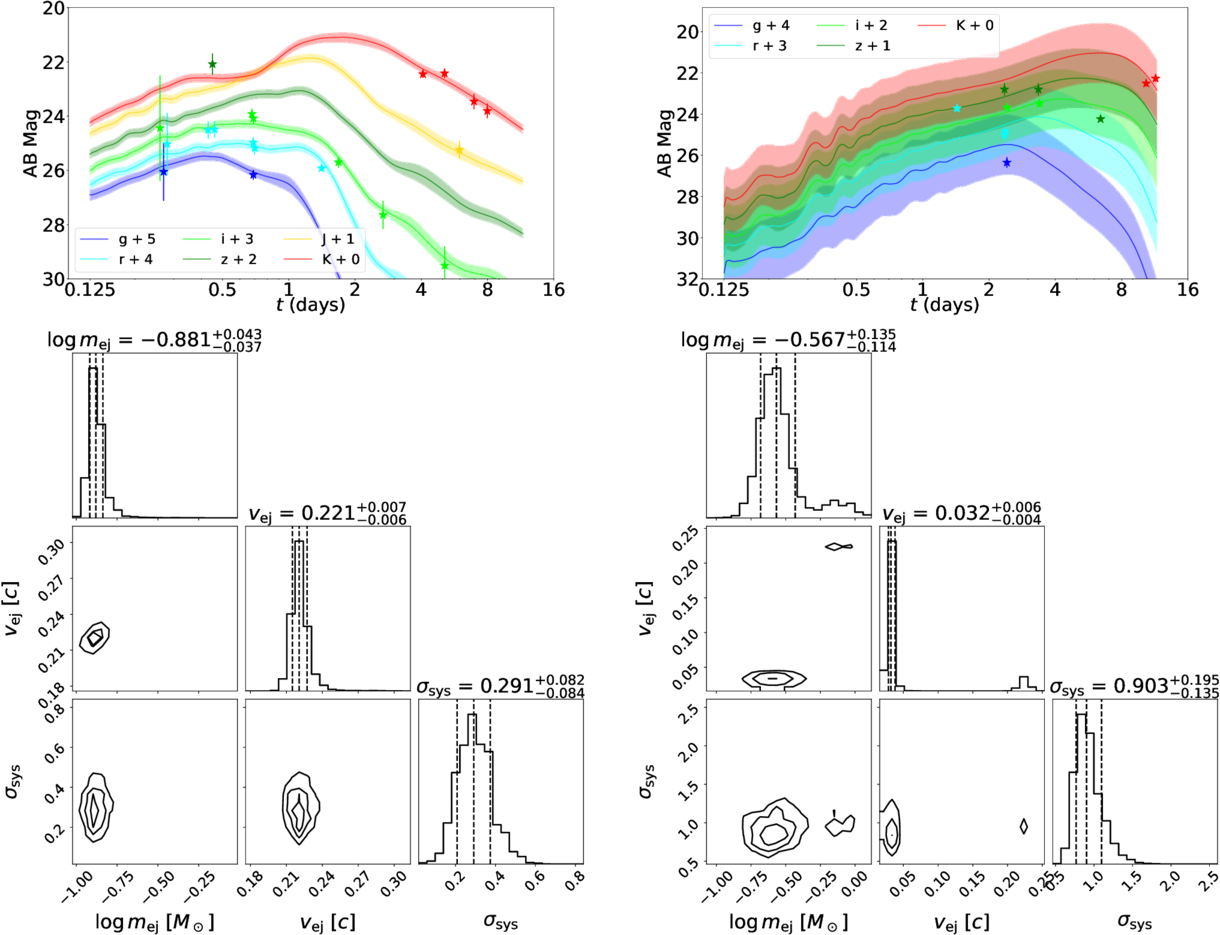 GRB 211211A (left) and GRB 230307A (right) optical/near-infrared observations compared to the best-fit interpolated light curve characterized by the parameter values reported in the posterior plots under the assumption of a weak r-process ejecta composition. The r and i observations at 0.27 days are artificially separated by ±0.01 days for visual clarity.