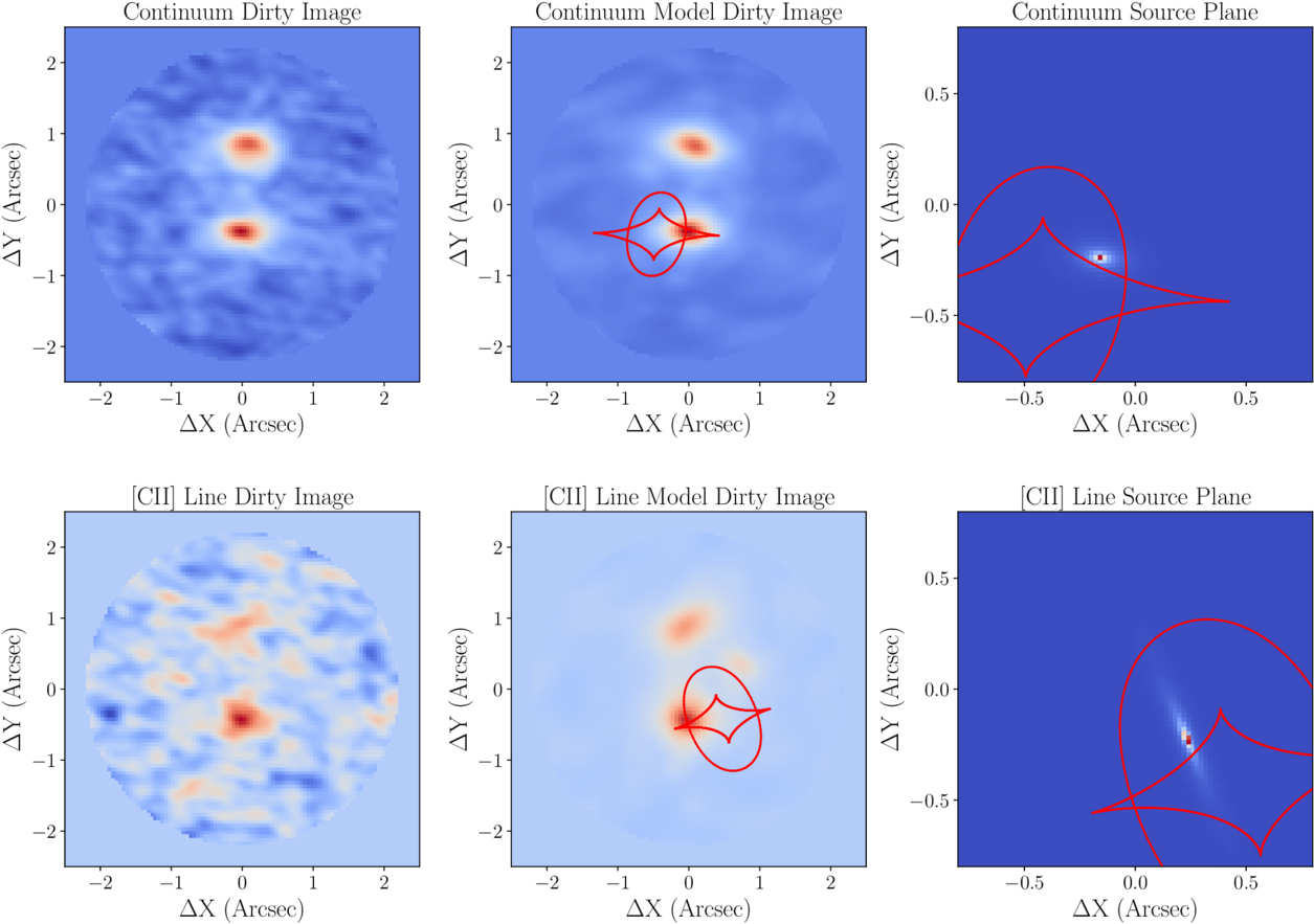 The best-fit lensing model for the continuum and [C II] line emission. From left to right: the observed dirty image, the modeled dirty image, and the source plane emission. The red lines mark the caustics of the best-fit lensing models. The best-fit lensing configuration for the continuum emission and the [C II] line differ significantly, essentially ruling out the strong lensing hypothesis for J2037–4537.