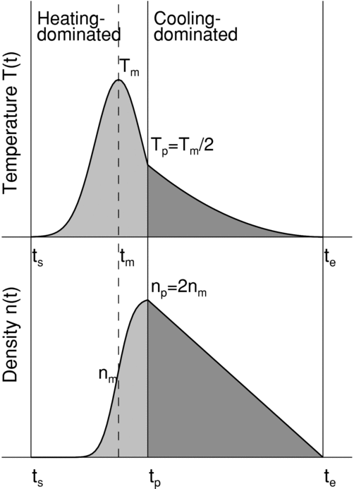 Generic time evolution of temperature T( t) and electron density n( t) during an impulsive heating process with subsequent cooling, subdivided into two time phases of (1) dominant heating ( t s < t < t p ) and (2) dominant cooling ( t p < t < t e ). The maximum of the temperature profile T m = T( t = t m ) occurs at time t m , and the density has a peak value n p = n e ( t = t p ) at time t p , approximately when the temperature drops to half of the maximum value, i.e., T p = T m /2.