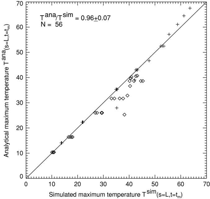 Comparison of analytical solutions of the maximum temperature T m = T( s = L, t = t m ) at the loop apex with the values obtained from numerical hydrodynamic simulations. The temperature values agree within a few percents for both apex (crosses) and footpoint heating (diamonds).