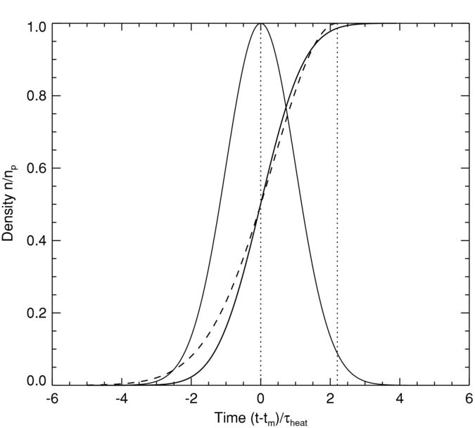 Heating rate E H ( t) is given by a Gaussian function (thin solid curve). The density function n( t) follows the time integral (thick solid curve) of this Gaussian function (for a constant value of dn evap/ dE H ) according to the Neupert effect, which can be approximated by a semi-Gaussian function (dashed curve). The time t m of the maximum heating rate and the time t p of the peak density are indicated with dotted lines.