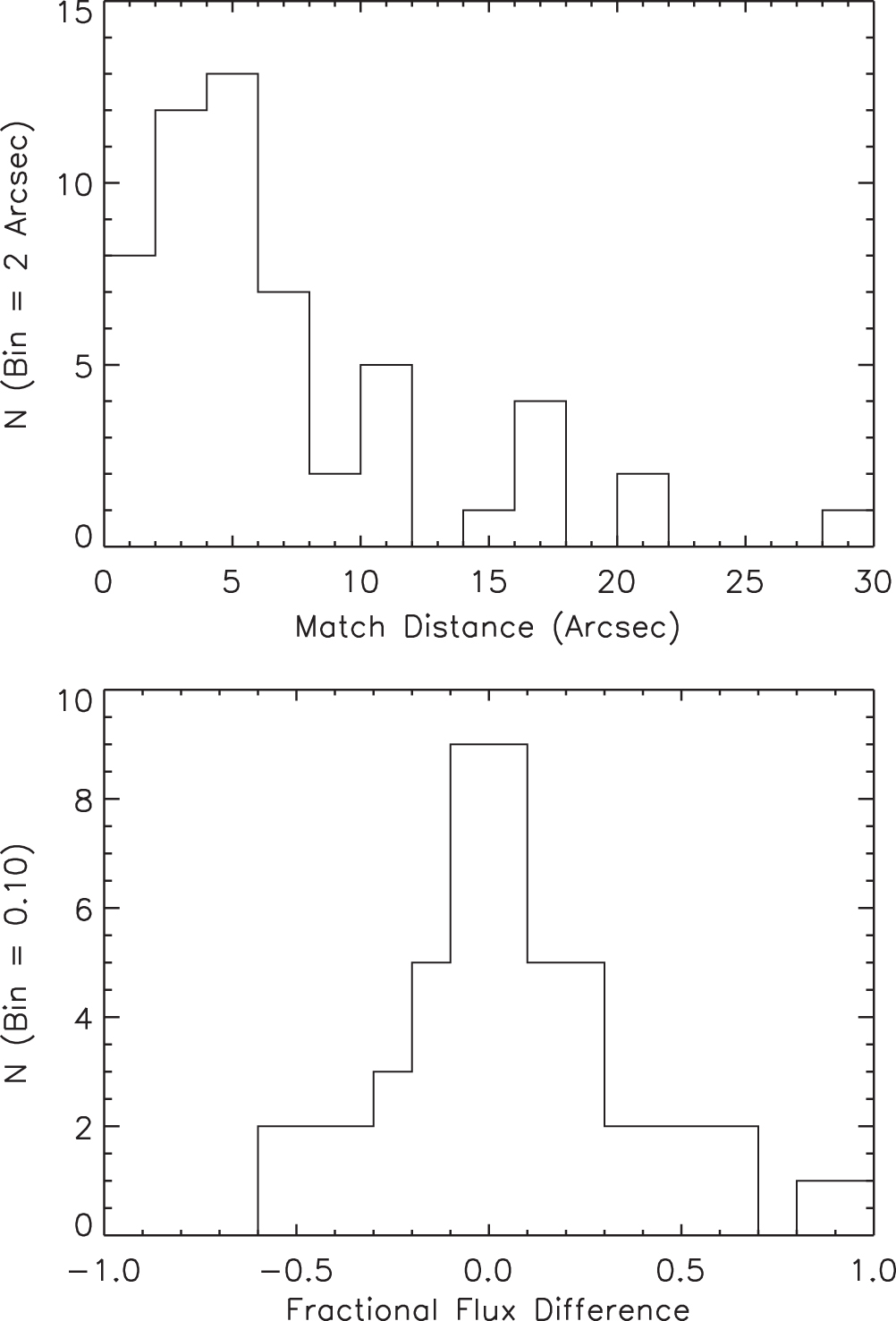 Source match distance distribution (top panel) and fractional soft flux difference distribution (0.5–2 keV, bottom panel) between the cluster catalog of this paper and Tundo et al. (2012).