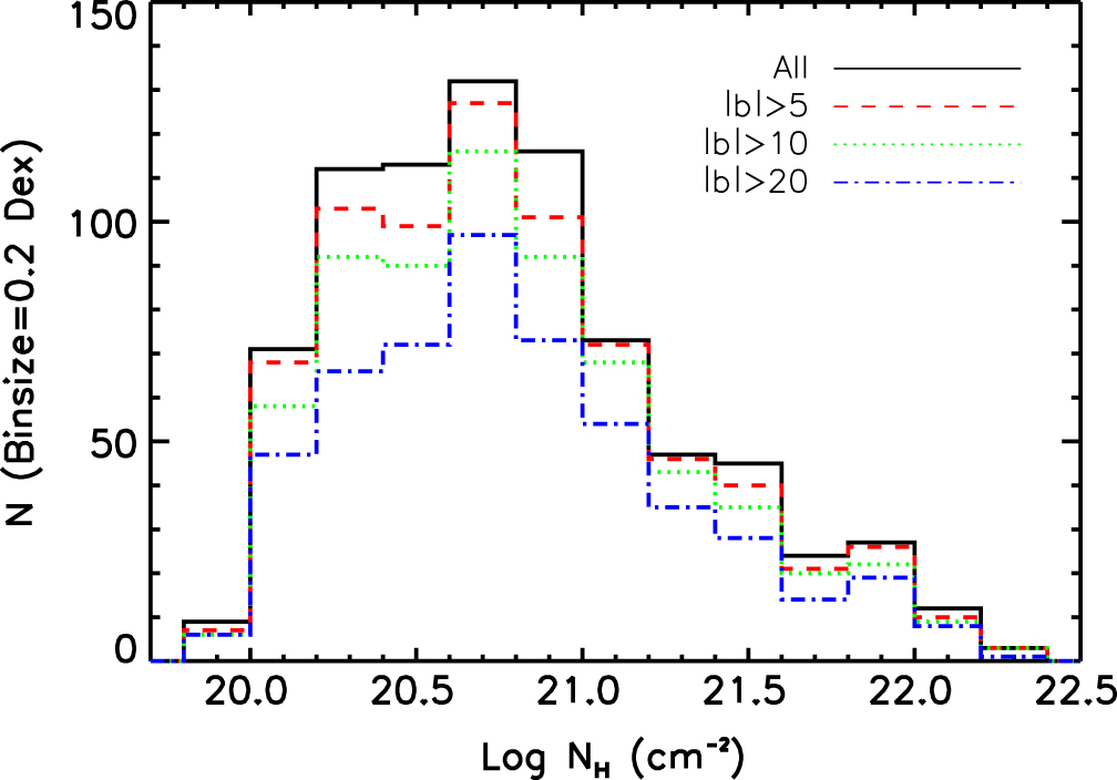 Galactic ﹩{{N}_{{\rm H}}}﹩ column density for all of the Swift fields (black solid line), and those with Galactic latitudes of ﹩|b|\geqslant 5﹩ (red dashed line), ﹩|b|\geqslant 10﹩ (green dotted line), and ﹩|b|\geqslant 20﹩ (blue dotted–dashed line), respectively.