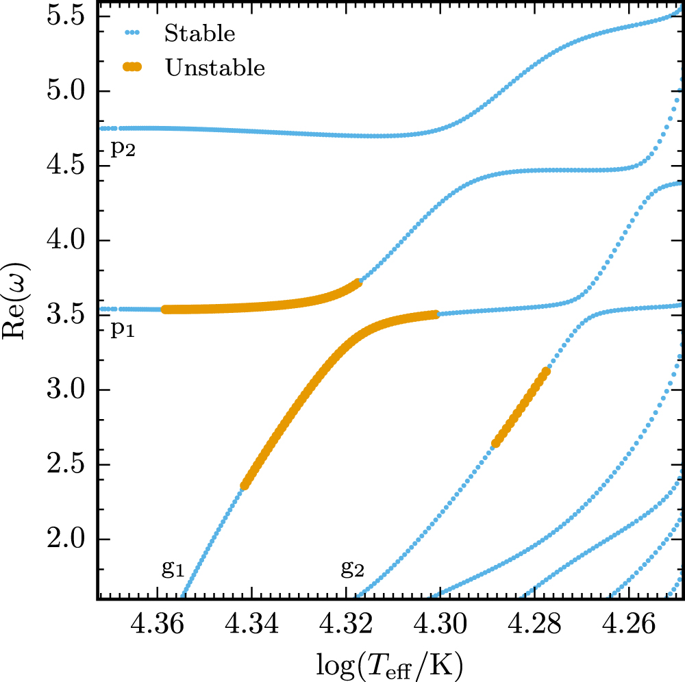 The ﹩{\ell }﹩ = 1 dimensionless frequency spectrum of an 8.5 ﹩{{\rm{M}}}_{\odot }﹩ stellar model as it evolves from the ZAMS to the REMS. Blue (orange) dots indicate which modes are stable (unstable); selected modes are labeled along the left/bottom edge using their classification.