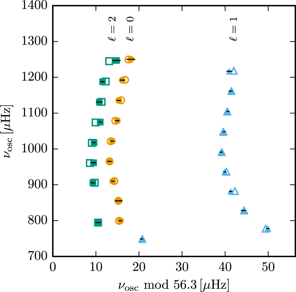 Echelle diagram for the subgiant star HD 49385. Observed frequencies are shown as filled circles (﹩{\ell }=0﹩), triangles (﹩{\ell }﹩ = 1) and squares (﹩{\ell }﹩ = 2); black horizontal lines indicate the 1σ error bars. Calculated frequencies of the best-fit model are overplotted as the corresponding open symbols.