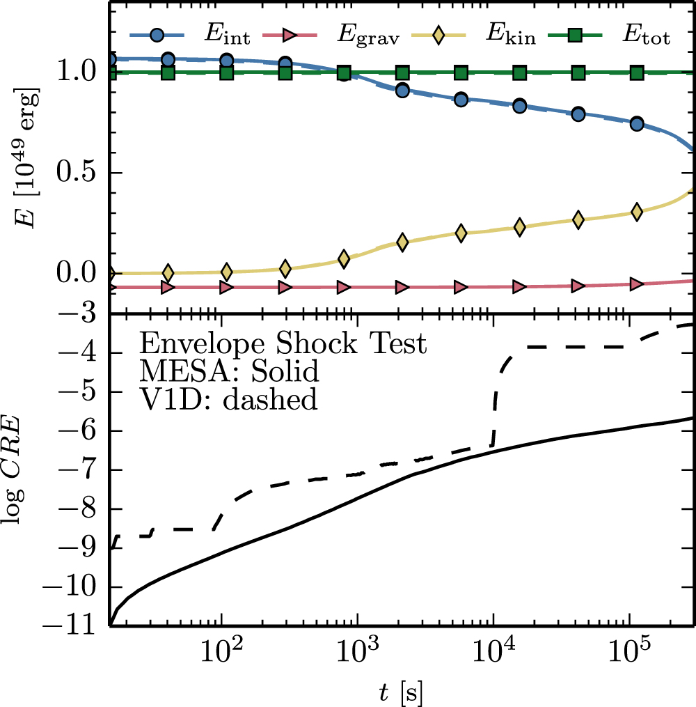 Top: evolution of internal energy ﹩{E}_{\mathrm{int}}﹩, gravitational energy ﹩{E}_{\mathrm{grav}}﹩, kinetic energy ﹩{E}_{\mathrm{kin}}﹩, and their sum ﹩{E}_{\mathrm{tot}}﹩ for the envelope shock test simulated with MESA and V1D. Bottom: log of cumulative relative error CRE (Equation (58)) of the total energy ﹩{E}_{\mathrm{tot}}﹩. We neglect sources (nuclear burning) and sinks (radiation losses), which are negligible.