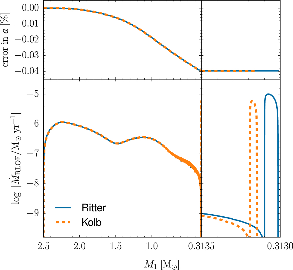 Evolution of mass transfer rate from a ﹩2.5\;{M}_{\odot }﹩ to a ﹩1.4\;{{\rm{M}}}_{\odot }﹩ point mass, assuming a mass transfer efficiency of ﹩1\%﹩. The upper panel shows the difference between the computed orbital separation and the analytical solution while the bottom one displays the evolution of the mass transfer rate, using two different schemes.