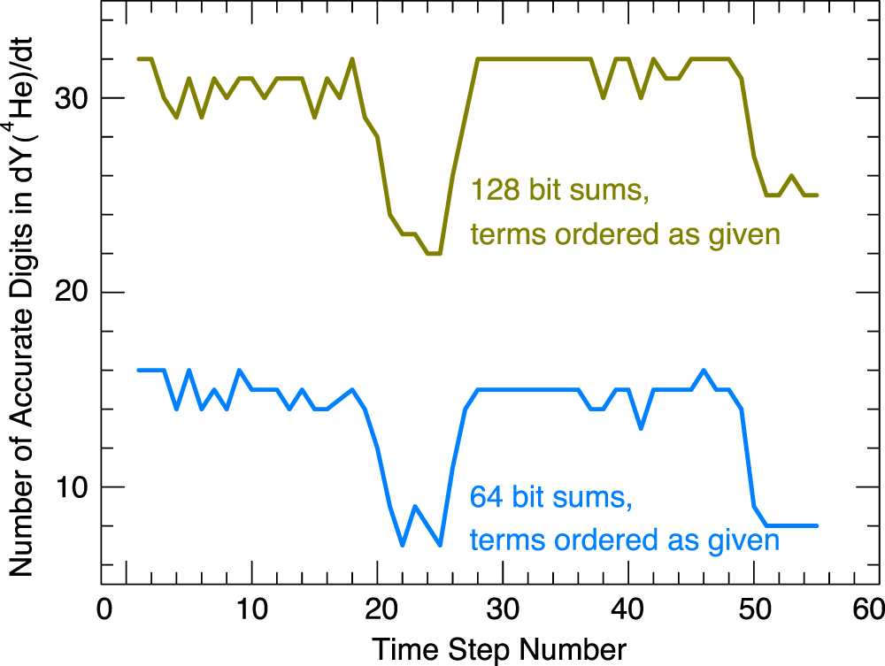 Number of accurate digits in 64-bit and 128-bit summations for ﹩\dot{Y}{(}^{4}\mathrm{He})﹩ as measured by the 100 digit sum calculated by the multiple precision packages. The x-axis gives the timestep number for the integration done with IEEE 128-bit summations. The number of accurate digits in ﹩\dot{Y}(p)﹩ and ﹩\dot{Y}(n)﹩ are within a few digits of ﹩\dot{Y}{(}^{4}\mathrm{He})﹩.