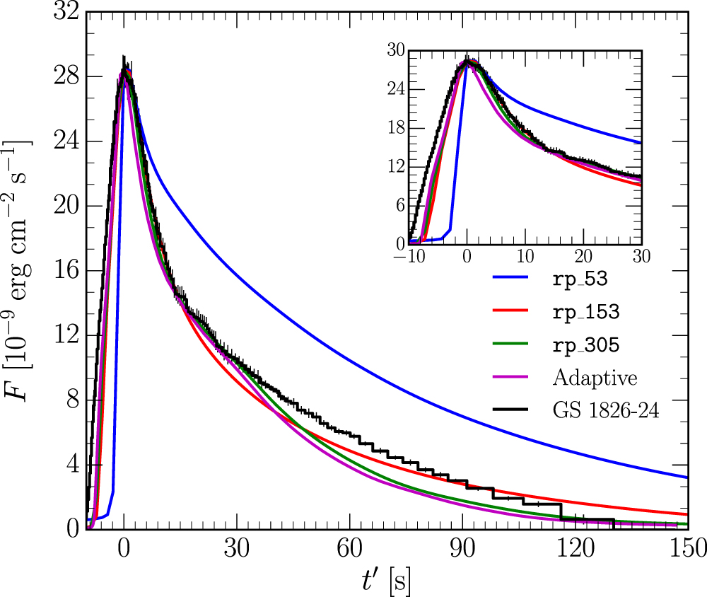 Folded burst profiles for the different nuclear networks as compared to GS 1826-24 for an accretion rate of ﹩3\;\times \;{10}^{-9}\;{{\rm{M}}}_{\odot }\;{\mathrm{yr}}^{-1}﹩ with 2% metals with a solar composition, Three rp network models are shown and one of the adaptive net models. The insert shows a zoom in of the first ﹩30\;{\rm{s}}﹩ during the burst.