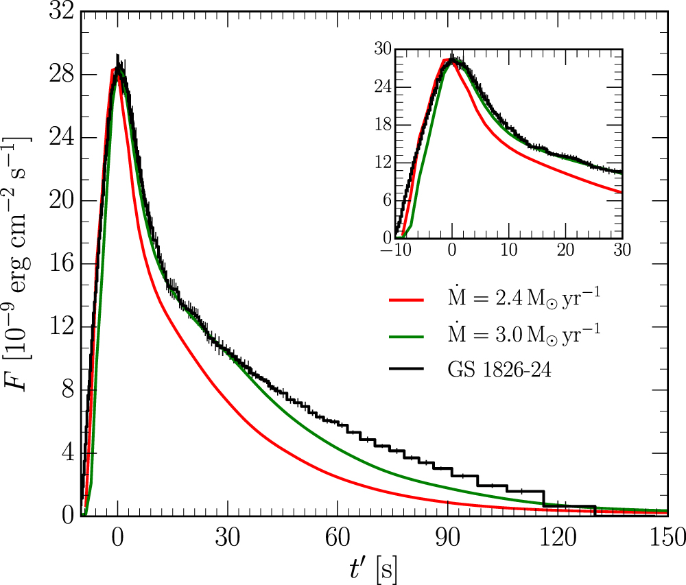 Folded burst light curve for the rp_305 net, with a solar metallicity accretion composition, shown for ﹩\dot{M}=2.4\;\times \;{10}^{-9}\;{{\rm{M}}}_{\odot }\;{\mathrm{yr}}^{-1}﹩ and ﹩\dot{M}=3\;\times \;{10}^{-9}\;{{\rm{M}}}_{\odot }\;{\mathrm{yr}}^{-1}﹩, normalized to the peak flux measured for GS 1826-24. The insert shows the first ﹩30\;{\rm{s}}﹩ of the burst.