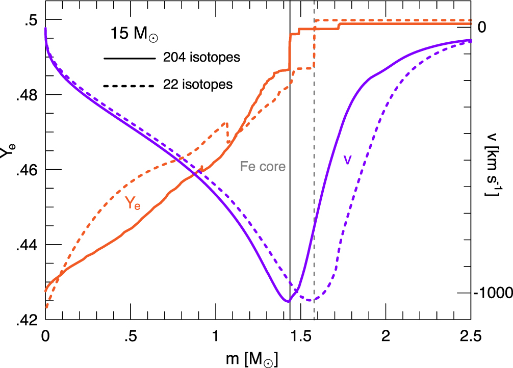 Radial velocity and ﹩{Y}_{{\rm{e}}}﹩ profiles at the onset of core collapse for the Mi = 15 ﹩{{\rm{M}}}_{\odot }﹩ model. Dashed curves show the results using a 22 isotope network and solid curves show the results using a 204 isotope network. Both models are evolved from the pre main-sequence to the onset of core collapse with their respective reaction network. The vertical gray lines mark the mass of the iron core as defined by the ﹩{Y}_{{\rm{e}}}﹩ jump.