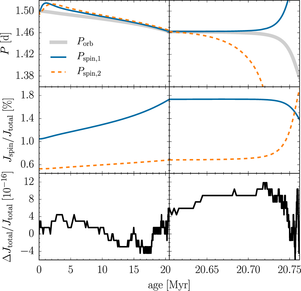 Angular momentum evolution in an ﹩8\;{{\rm{M}}}_{\odot }+6\;{{\rm{M}}}_{\odot }﹩ binary with an initial orbital period of 1.5 days. Left panels show the evolution before the onset of RLOF, while right panels display evolution from the beginning of RLOF until contact, when both components fill their Roche lobe. The fractional error in the total angular momentum is plotted in the bottom panel and is of order machine-precision.