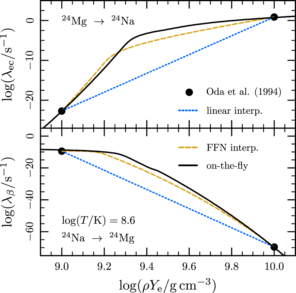 Top panel (bottom panel) shows the rate of electron capture on ﹩{}^{24}\mathrm{Mg}﹩ (beta decay of ﹩{}^{24}\mathrm{Na}﹩) as a function of density at a fixed temperature of ﹩\mathrm{log}(T/{\rm{K}})=8.6﹩. The Oda et al. (1994) tabulated points are shown as black dots. The dotted line shows the result of using linear interpolation between the tabulated points. The dashed line shows the result of using the physically motivated interpolation method suggested by Fuller et al. (1985). The solid line shows the rate calculated using the on-the-fly rate calculation capability of MESA documented in this section. Slight differences between points and the line are due to differences in the input nuclear data.