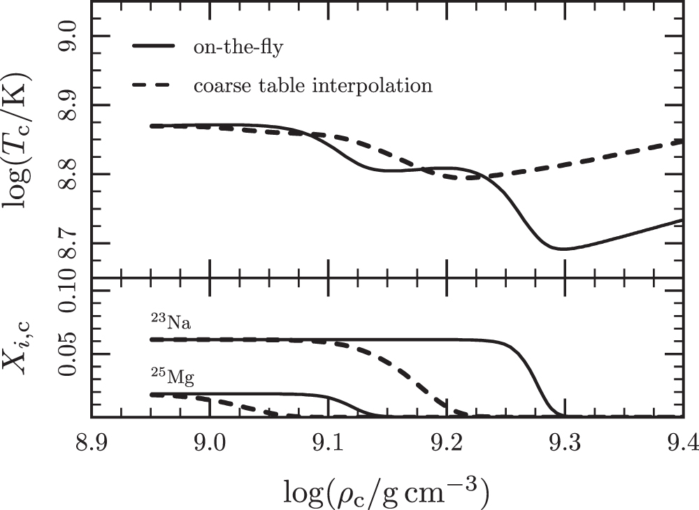 Top panel shows the evolution of ﹩{T}_{{\rm{c}}}﹩ and ﹩{\rho }_{{\rm{c}}}﹩ in an 8.8 ﹩{M}_{\odot }﹩ star. The bottom panel shows the central ﹩{}^{25}\mathrm{Mg}﹩ and ﹩{}^{23}\mathrm{Na}﹩ mass fractions. The solid lines show the evolution using the on-the-fly rates, the dashed lines show the results when interpolating in coarse tables. The locations of the changes in mass fraction match the locations of cooling in the top panel. This demonstrates the importance of densely sampled weak rates to the evolution of the core.