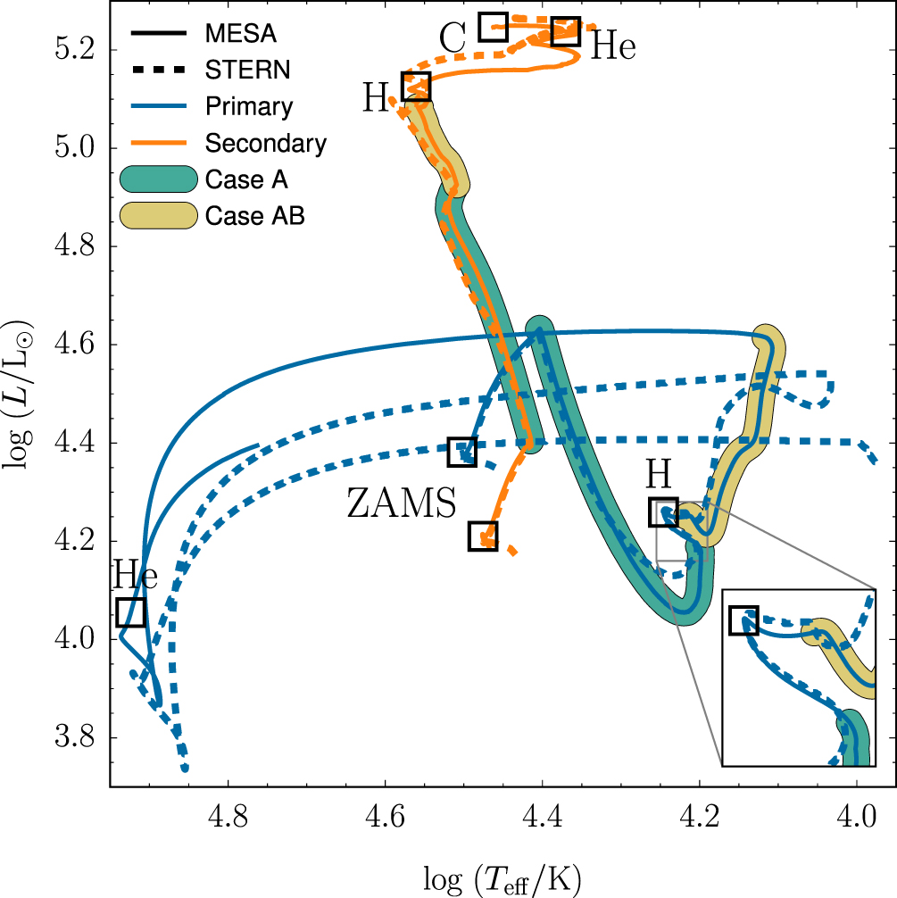 Evolution of a ﹩16\;{{\rm{M}}}_{\odot }+14\;{{\rm{M}}}_{\odot }﹩ system with a 3 day initial orbital period. MESAbinary models are compared to the results of Wellstein et al. (2001), which were calculated using the STERN code. The terms primary and secondary are used throughout the evolution to describe the initially more massive and the less massive components, respectively. For each component in the MESAbinary model, squares mark the ZAMS and the depletion of the indicated nuclear fuel in the core.