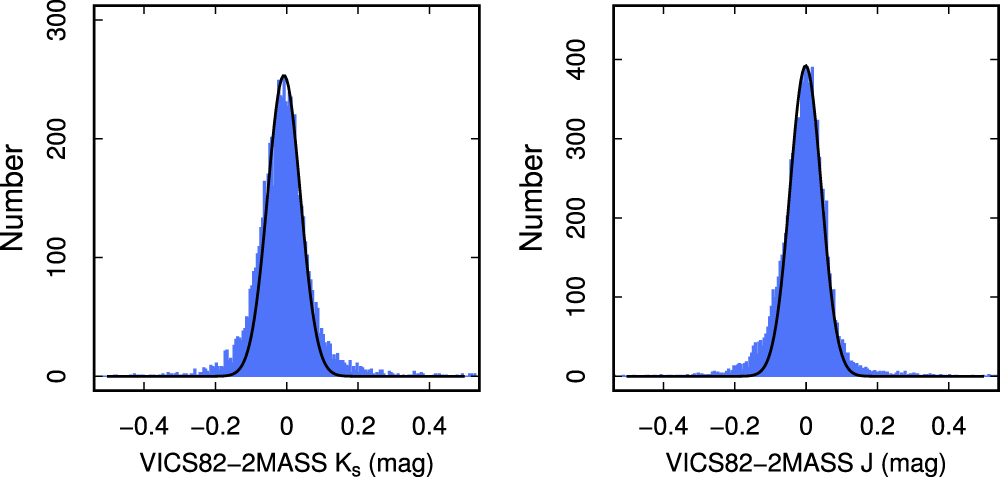 Comparison of 2MASS and VICS82 J and ﹩{K}_{{\rm{s}}}﹩ magnitudes for sources with total magnitudes in the range Ks = 15–15.25 mag. Each histogram contains a total of 104 randomly selected sources across the survey. The width (σ) of each distribution is 0.044 and 0.046 mag, where we have fit a Gaussian to the central distributions after clipping. Note that these numbers are averaged over both CFHT and VISTA photometry across the full VICS82 survey area.