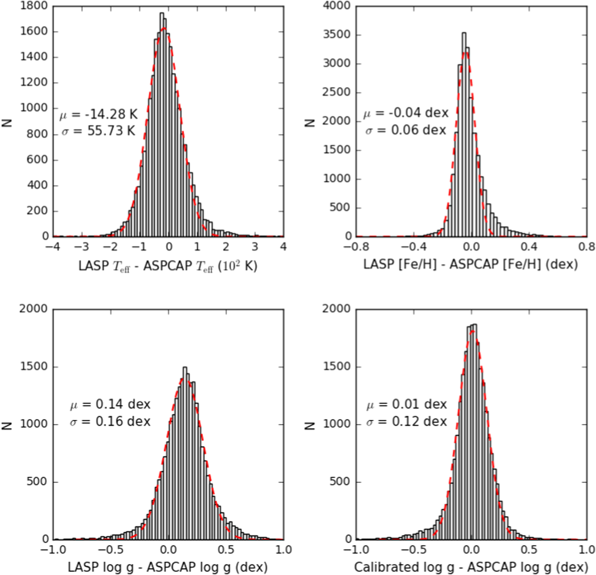 Histograms of differences between the LASP-derived parameters and the ASPCAP-derived parameters from the 24,196 common targets. The red dashed curves are Gaussian fits to the distributions, and the mean and dispersion of the Gaussian fit to the mean and standard deviation values of the differences are also labeled. The lower right side shows the differences between the calibrated LASP–log g and the ASPCAP–log g.