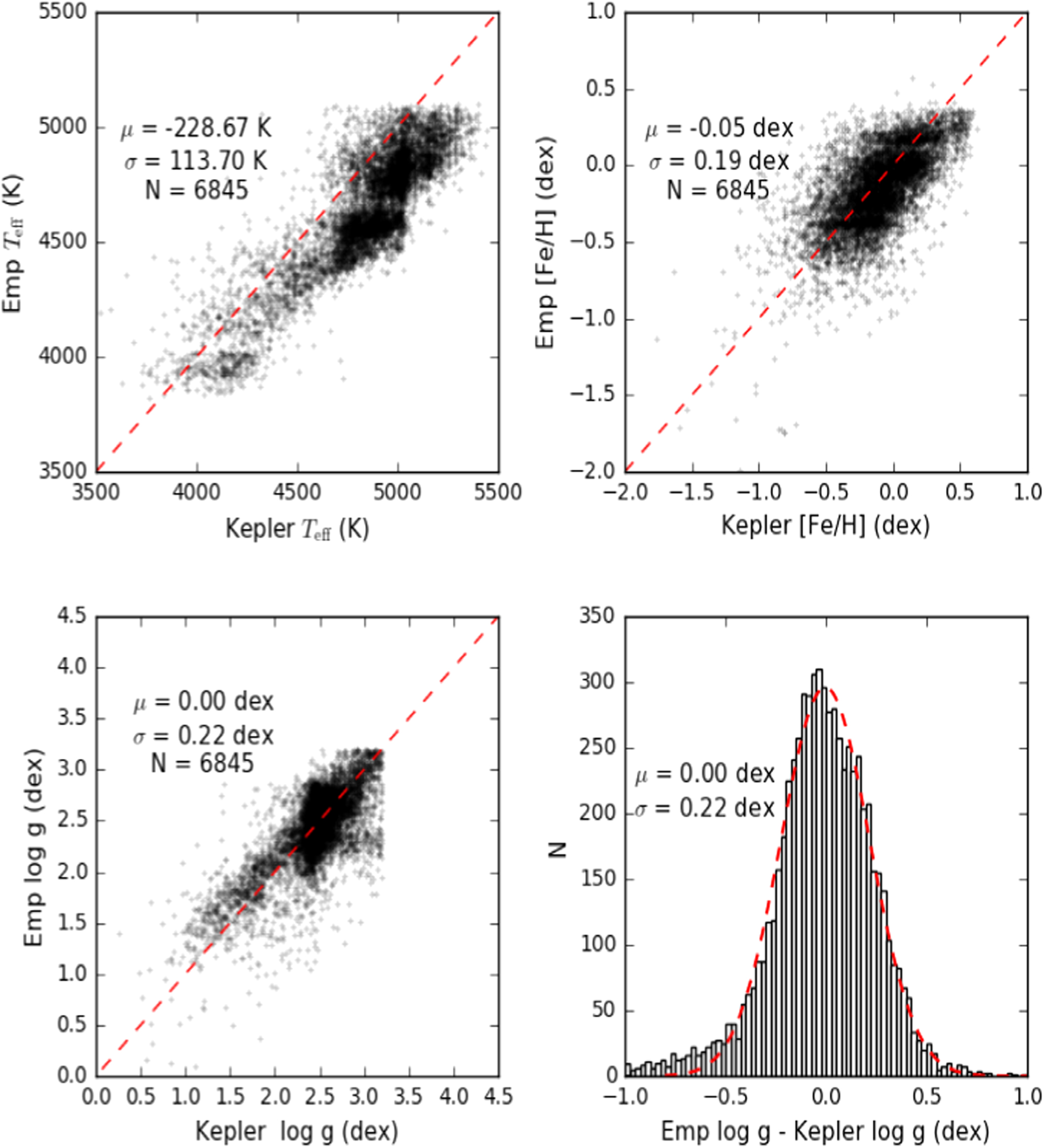 Comparison of the stellar parameters estimated from the LAMOST spectra using our library to the reference Huber parameters from the NASA Kepler mission. The lower right panel shows the differences between the Emp–log g and the Kepler–log g; no systematic shift was noted.