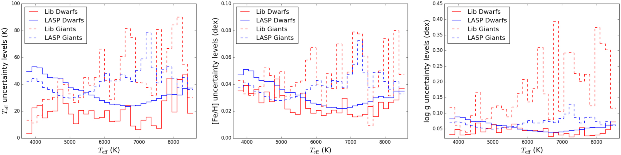 Distributions of the uncertainty levels of this library and LASP in the Teff bins in steps of 150 K, left: Teff uncertainty levels; middle: [Fe/H] uncertainty levels; right: log g uncertainty levels. The blue (red) lines represent the results of LASP (our library), whereas the solid (dashed) lines represent the results of roughly dwarfs (giants).