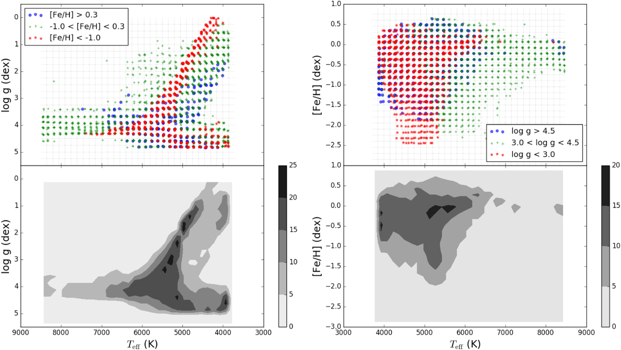 Distributions of our library in the Teff–log g and Teff–[Fe/H] planes of the labeled parameters. In the top left and right panels, the symbol color distinguishes different metallicity (surface gravity) classes. The bottom panel shows a contour map of the numbers of stars in the Teff–log g (left) and Teff–[Fe/H] (right) planes with grid steps of (150 K, 0.25 dex) and (150 K, 0.15 dex), respectively.