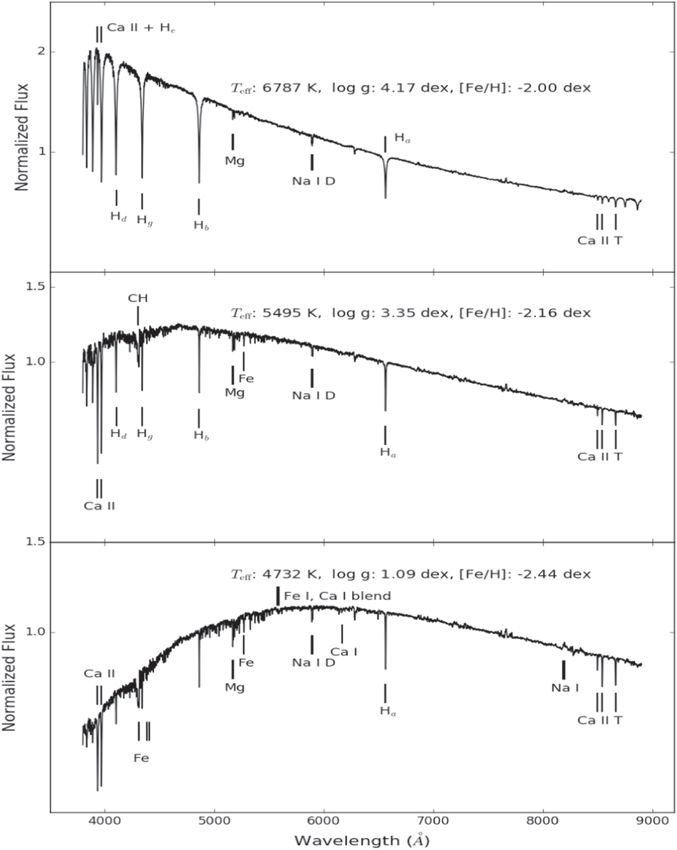 Example spectra of low-metallicity stars from three Teff–log g grid nodes. All of the prominent absorption features are labeled as in Figure 5 for comparison: Ha for Hα, Hb for Hβ, Hg for Hγ, Hd for Hδ, and He for Hϵ.