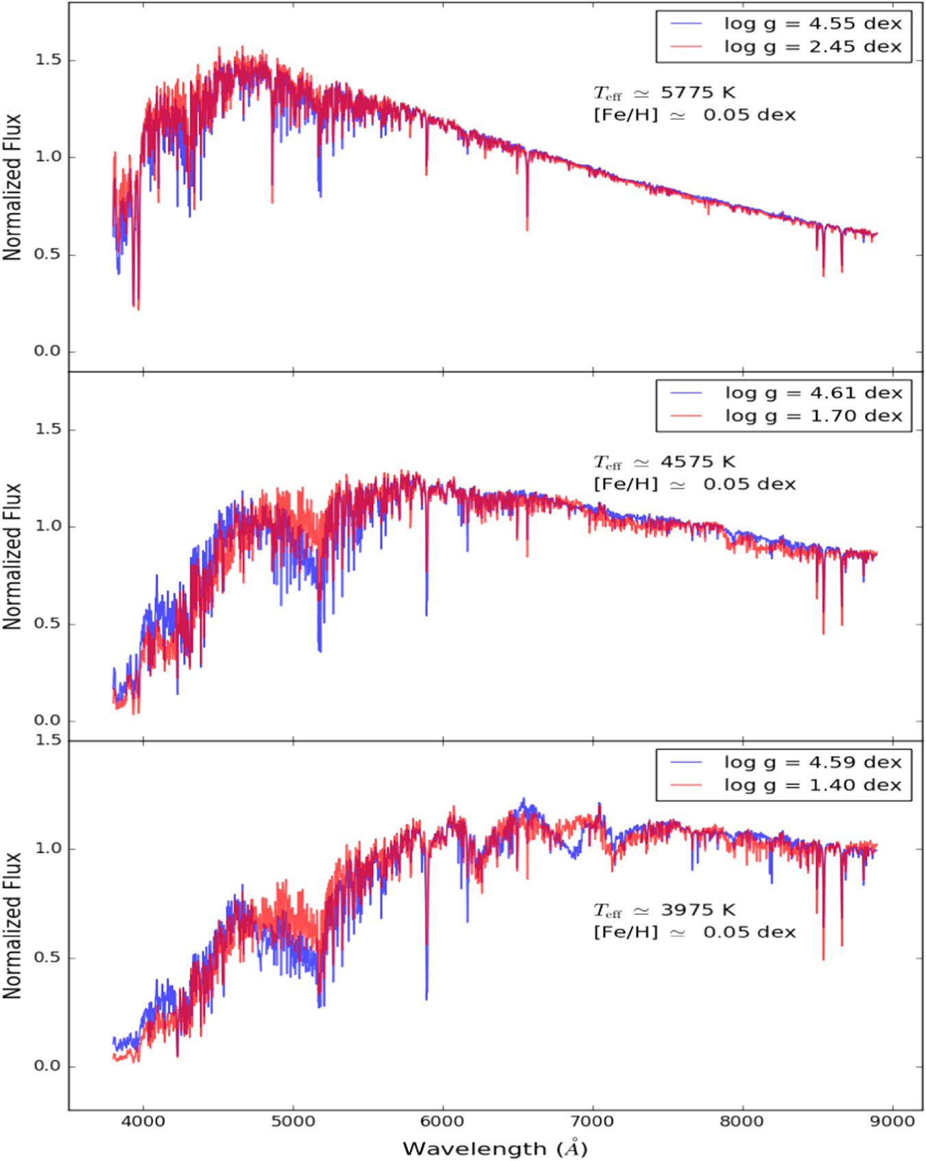 Surface gravity comparison between dwarf and giant templates of the same metallicity and temperature for the entire spectrum. The blue (red) line shows the dwarf (giant) template.