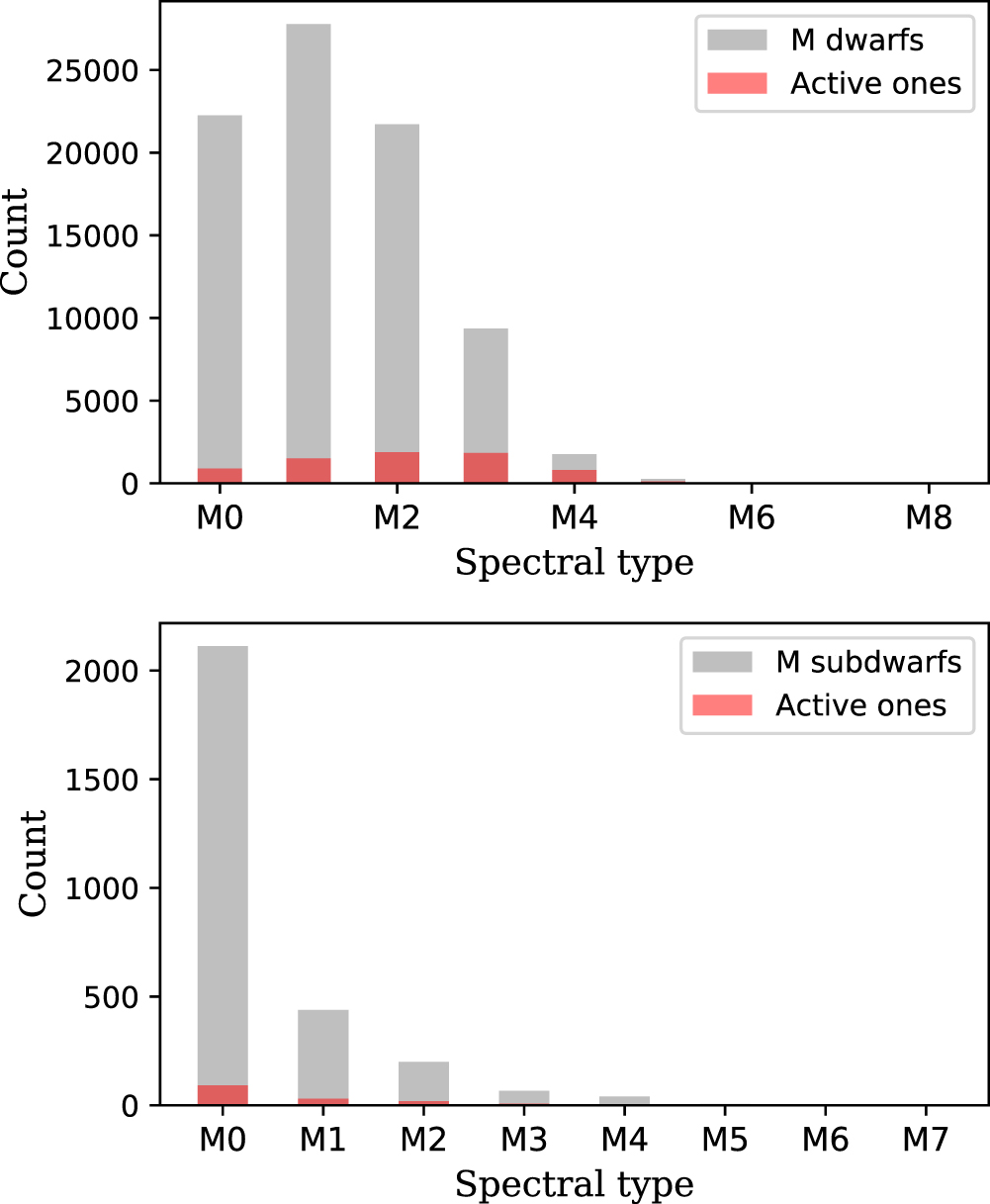 SpT distribution of visually identified M dwarfs (83,213 in total, top panel) compared with SpT distribution of subdwarfs (bottom panel). The magnetic activity fraction for each spectral subtype, detected by Hα emission following the precepts of West et al. (2011), is shown as red bars. We found 7075 active M dwarfs and 141 M subdwarfs. The figure shows that the magnetic activity fraction is a function of the spectral type for M dwarfs, which is consistent with former studies (West et al. 2011). For subdwarfs, the active subsample remains too small to draw a reliable conclusion.