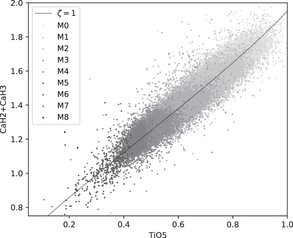 Recalibration of the ζTiO/CaH parameter (denoted as ζ for short) based on a sample of 83,213 M-dwarf spectra from the LAMOST regular survey. ζ is a combination of the TiO5, CaH2, and CaH3 spectral indices (see definition in Equation (5)) and has been shown to be correlated with the metallicity. The black curve is an iso-ζ line with ζ = 1, providing an estimate of the TiO-to-CaH ratio in an object of a solar metallicity. Smaller ζ values correspond to stars of lower metallicities. The index was first introduced in Lépine et al. (2007) and then recalibrated in Dhital et al. (2012) and Lépine et al. (2013). Table 2 compares these calibrations.