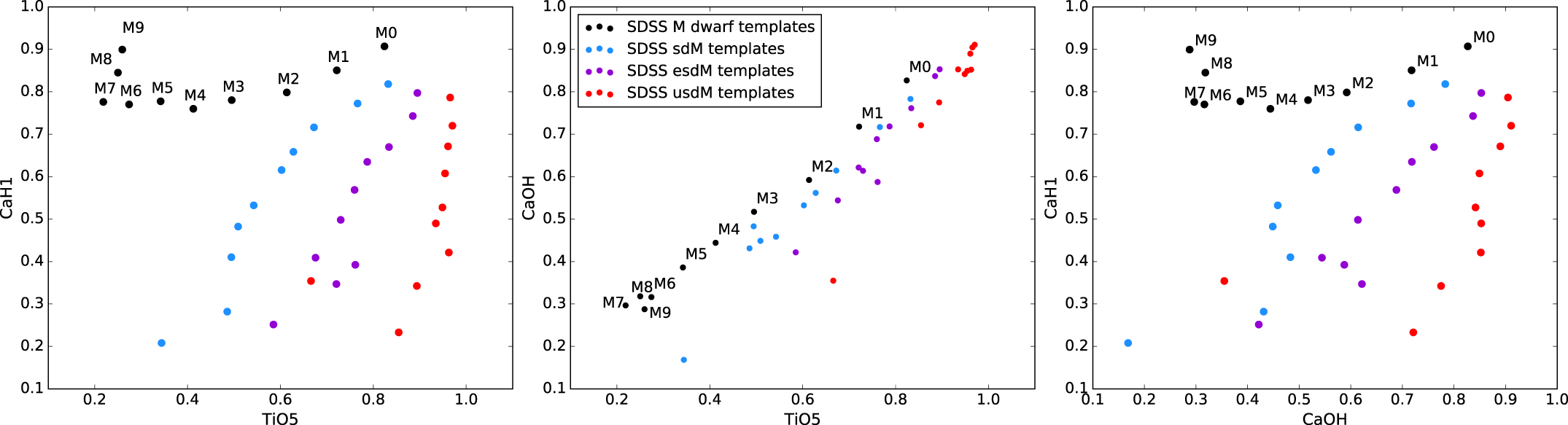 Three panels compare the M-dwarf template spectra built by Bochanski et al. (2007) from the Sloan Digital Sky Survey (SDSS) with M-subdwarf template spectra (sdM/esdM/usdM) built by S14, also from SDSS, on the [TiO5, CaH1], [TiO5, CaOH], and [CaOH, CaH1] index diagrams, respectively. The left panel shows that M subdwarfs are clearly separated from dwarfs by the CaH1–TiO5 index couple. The central panel shows that the CaOH index variation is consistent with that of the TiO5 index, leading to similar results between CaH1 vs. TiO5 (left panel) and CaH1 vs. CaOH (right panel) distributions. A CaOH–CaH1 relation can thus be defined on the [CaOH, CaH1] index diagram to separate subdwarfs from dwarfs.