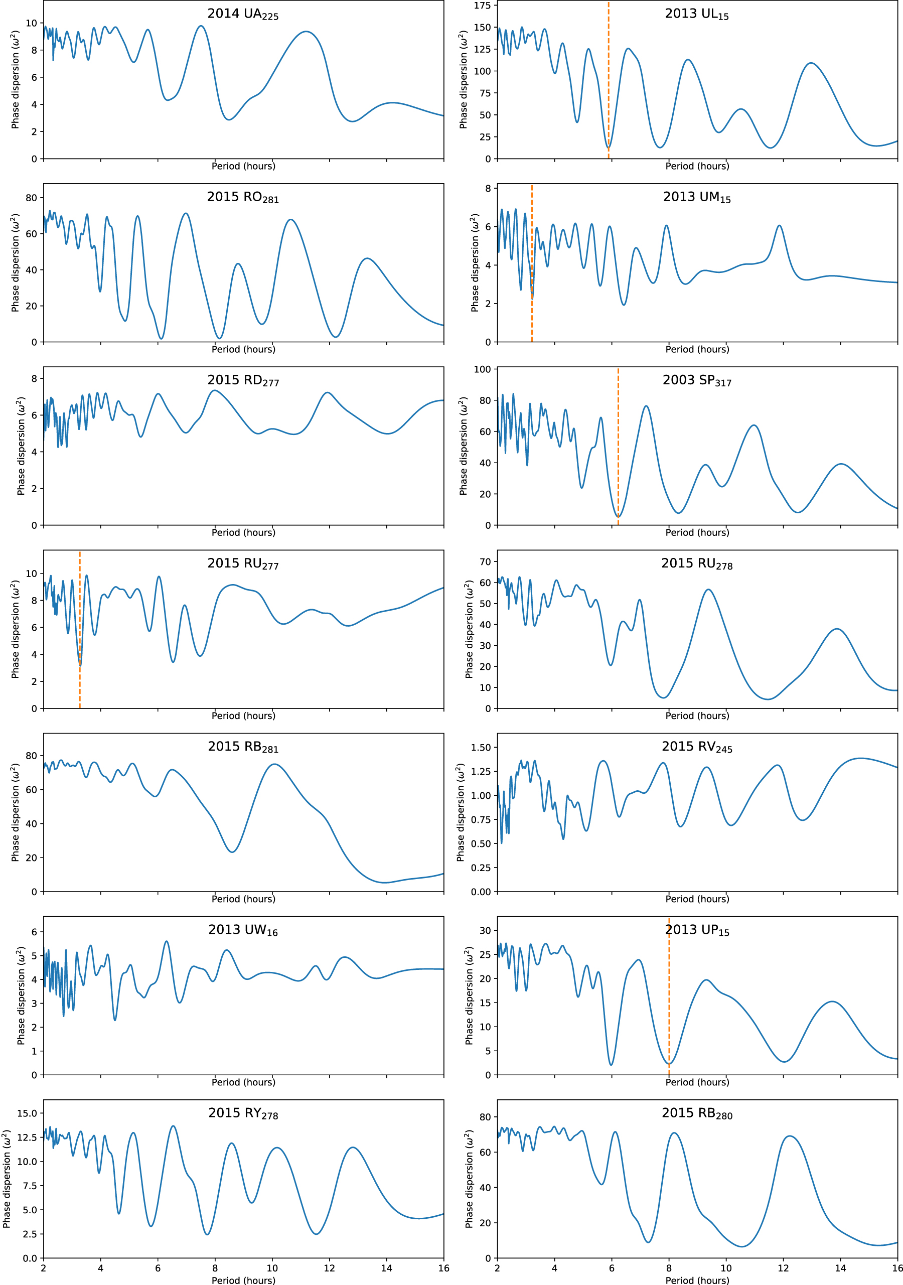 PDM plot from our period analysis. Vertical dashed orange lines show our favored single-peak period for the objects listed in Table 6 and shown in Figure 8. Objects 0–13, ordered by average magnitude shown here.