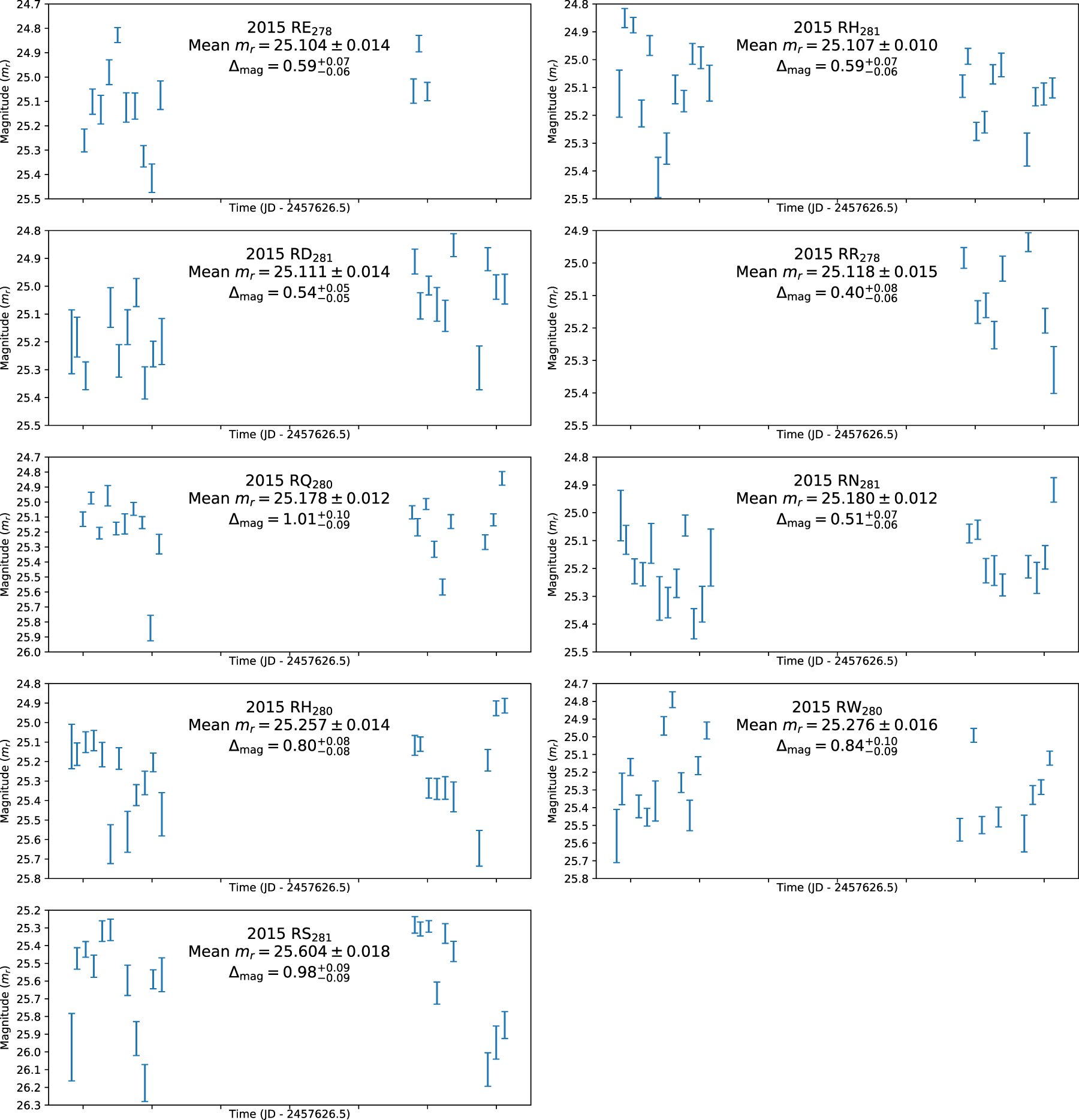 Absolutely calibrated photometry of our TNO sample. Objects 56–64, ordered by their average magnitude.