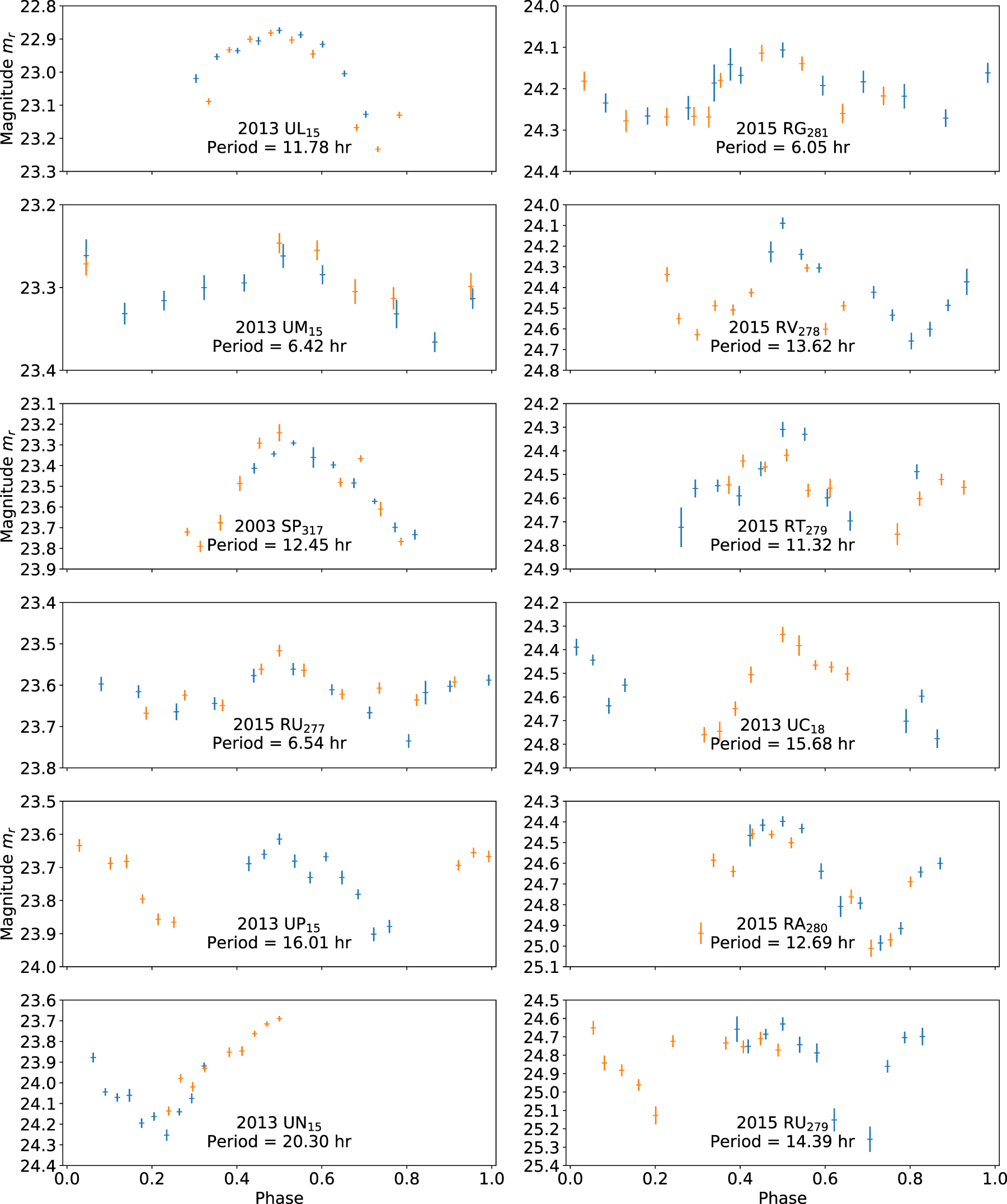 Folded light curves for the 12 objects for which we have a period estimate. Blue and orange points show data from the first and second nights, respectively. The arbitrary phase = 0 point was chosen such that the brightest measured magnitude falls at phase = 0.5. The exact values of the MJD, magnitude, and uncertainty of all observations can be found in Table 3.