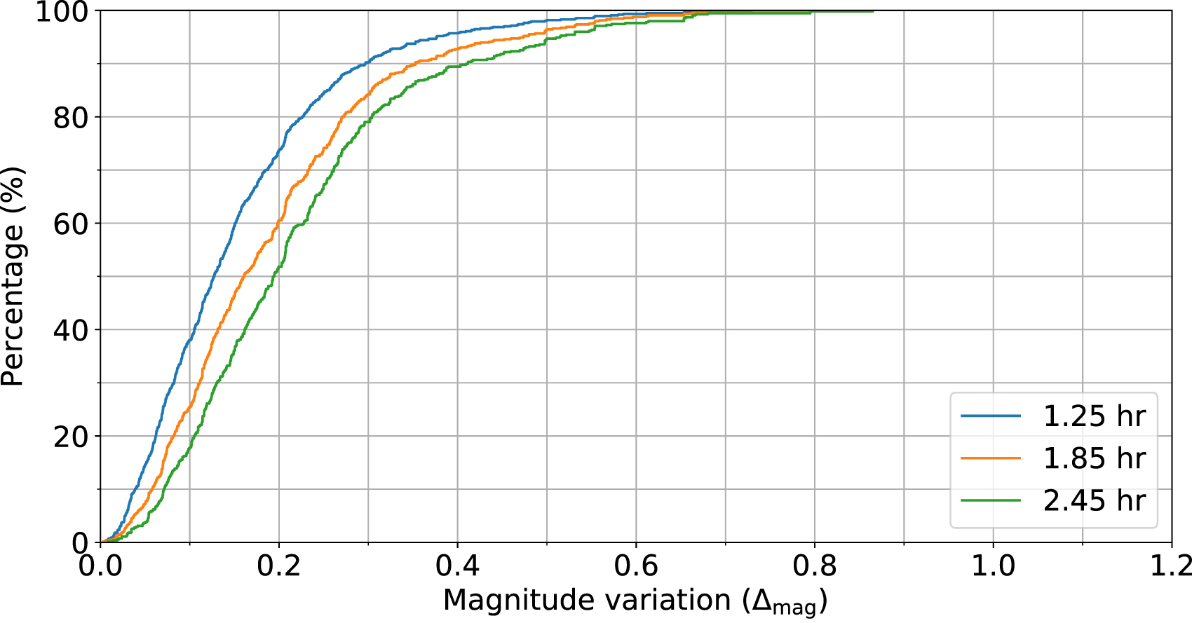 Cumulative distribution of the magnitude variation (the maximum minus the minimum: ﹩{{\rm{\Delta }}}_{\mathrm{mag}}﹩) within 1.25 hr (blue, top), 1.85 hr (orange, middle), and 2.45 hr (green, bottom) sections of light curves.