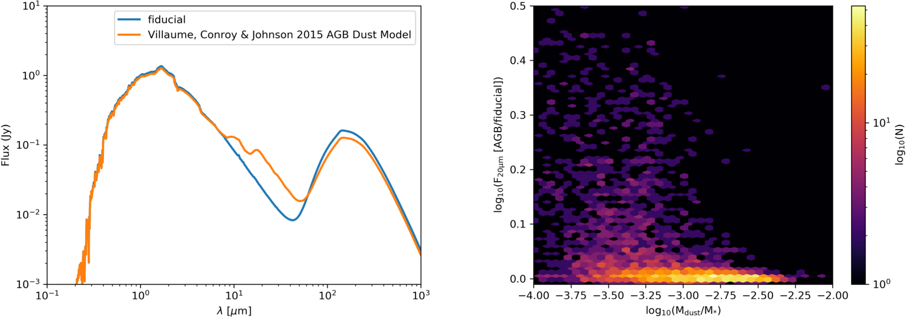 Impact of circumstellar AGB dust on the mid-IR SEDs of galaxies as a demonstration of the impact of stellar physics on POWDERDAY radiative transfer models. Left: example SEDs (without PAH models) of a quiescent galaxy with a low dust mass fraction from the SIMBA M25N512 simulation both including (orange) and not including (blue) the Villaume et al. (2015) model for circumstellar AGB dust. As is evident, in this galaxy with relatively low diffuse dust, the mid-IR flux is dominated by circumstellar AGB dust. Right: generalization of the left plot for 3000 galaxies at ﹩z=[0,1,2]﹩ from the same SIMBA M25N512 model, where we show the ratio of the ﹩24\,\mu {\rm{m}}﹩ flux density (as a proxy for the mid-IR) for a model with and without AGB dust vs. the fractional dust content of the galaxy. Colored points show a heat map of individual galaxy snapshots, with the color bar on the right. When the diffuse dust content is sufficiently large, the flux in the mid-IR is dominated by diffuse dust, and the ratio of mid-IR flux for both models converges to 1.