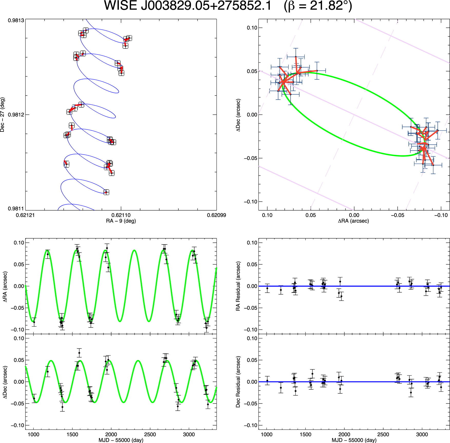 1 spacing. (Lower left) The change in R.A. and decl. as a function of time with the proper motion component removed. The parallactic fit is again shown in green. (Lower right) The R.A. and decl. residuals from the fit as a function of time.