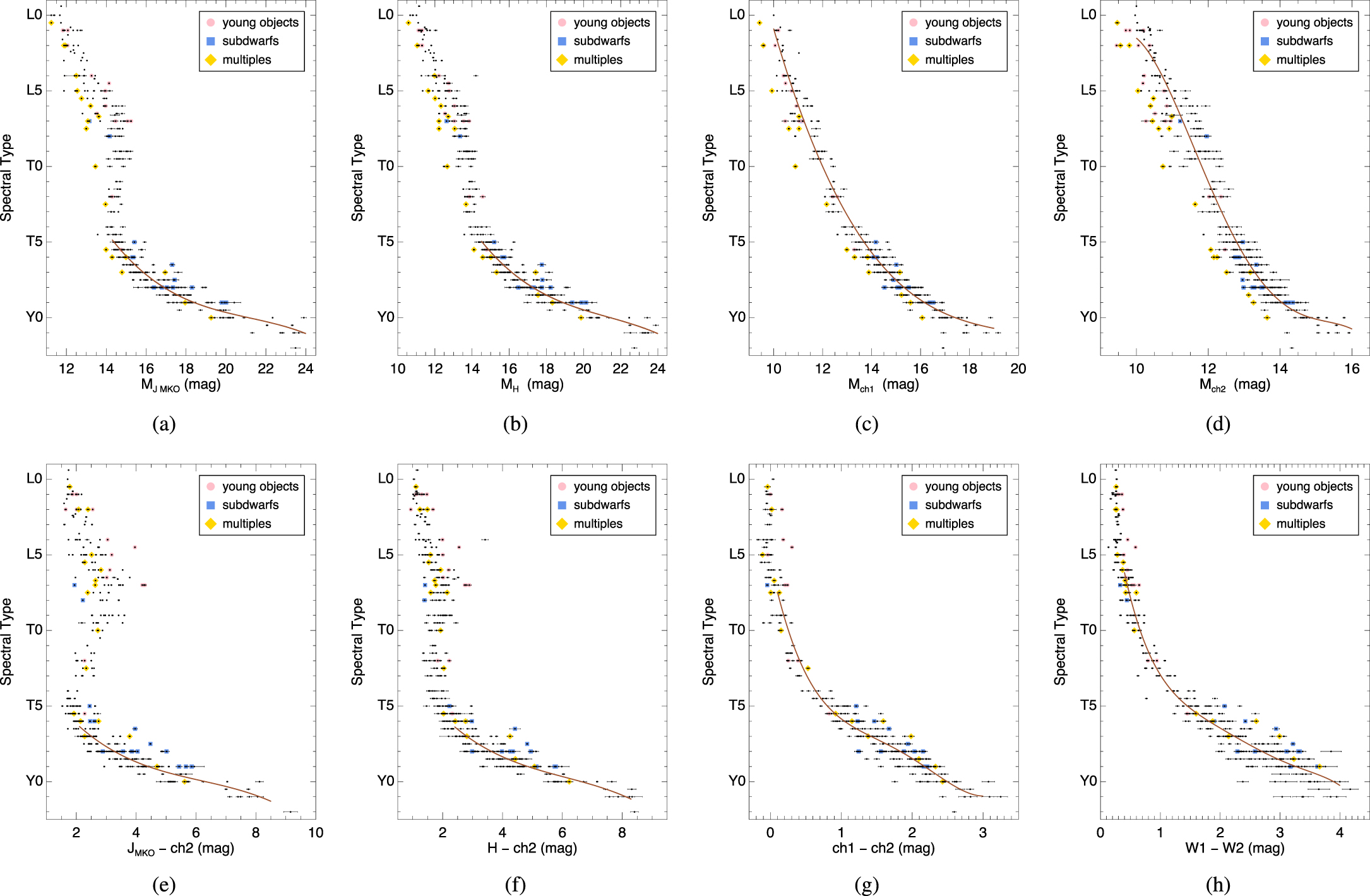 Plots identical to those of Figure 16, except that the x- and y-axes have been reversed. Polynomial fits to provide a translation from absolute magnitude or color into spectral type are shown in brown and described in Table 13. These fits exclude known young objects (pink circles, Section 7.1), subdwarfs (blue squares, Section 7.2), and multiple systems (yellow diamonds, Section 7.3).