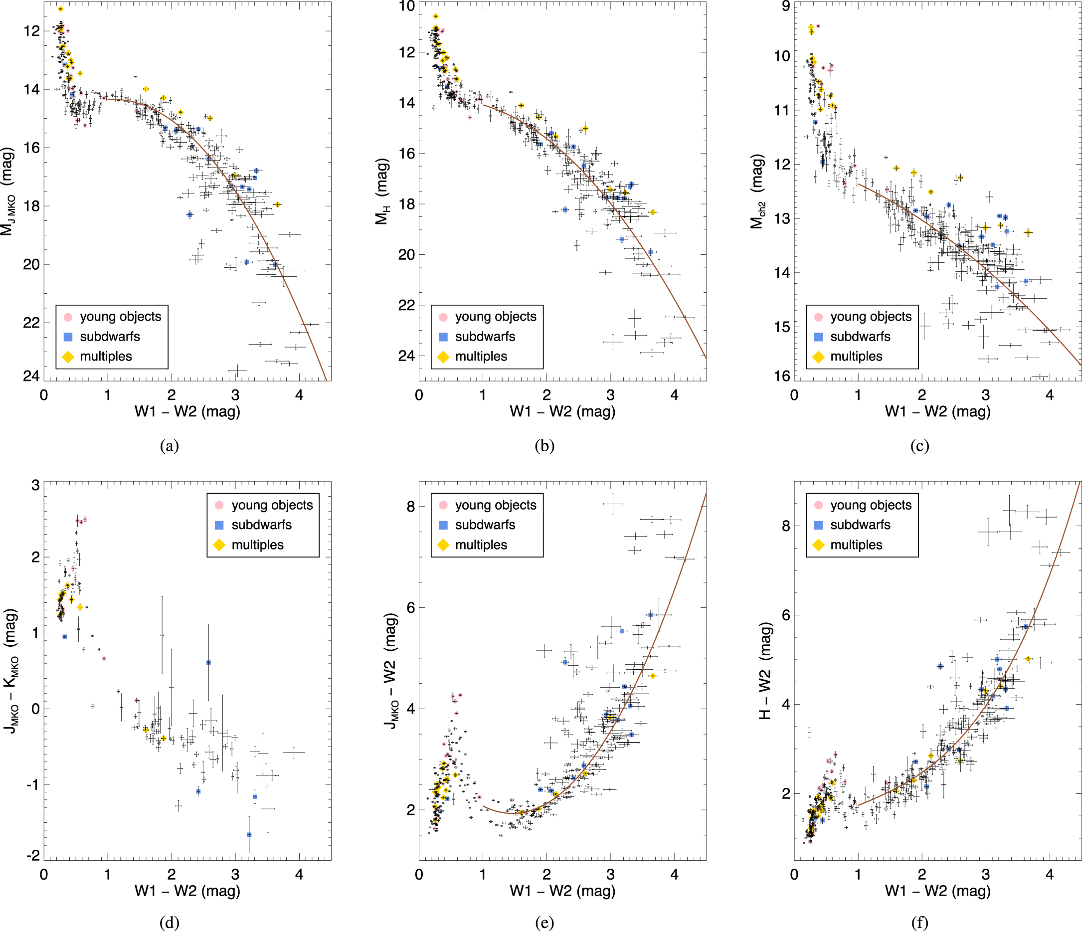 Plots of various absolute magnitudes (a)–(c) and colors (d)–(f) as a function of W1 − W2 color. Only members of the 20 pc census are shown, and plots (a)–(c) show only the subset of 20 pc objects having parallaxes measured to better than 12.5%. Polynomial fits that exclude known young objects (pink circles, Section 7.1), subdwarfs (blue squares, Section 7.2), and multiple systems (yellow diamonds, Section 7.3) are shown in brown and described in Table 13. In panels (a)–(c), the fits include only those points with W1 − W2 > 1.0 mag, and in panels (e) and (f), the fits include only those points with W1 − W2 > 0.8 mag.