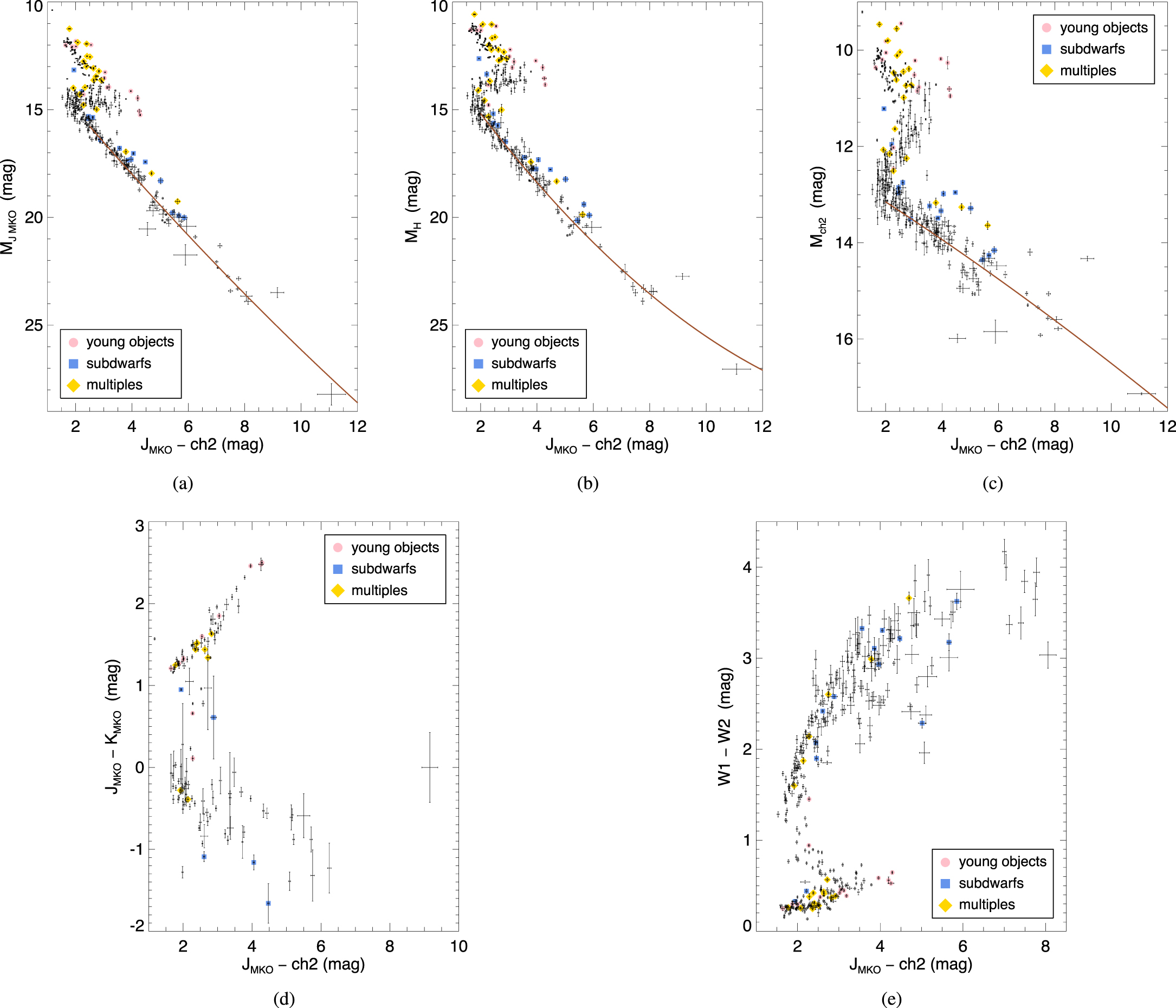 Plots of various absolute magnitudes (a)–(c) and colors (d)–(e) as a function of JMKO − ch2 color. Only members of the 20 pc census are shown, and plots (a)–(c) show only the subset of 20 pc objects having parallaxes measured to better than 12.5%. All five panels are supplemented with W2 magnitudes when ch2 is not available, as described in Section 7.4. Polynomial fits that exclude known young objects (pink circles, Section 7.1), subdwarfs (blue squares, Section 7.2), and multiple systems (yellow diamonds, Section 7.3) are shown in brown and described in Table 13. These fits are restricted to points with MJMKO ≥ 16.0 mag in panel (a), MH ≥ 15.0 mag in panel (b), and Mch2 ≥ 13.0 mag in panel (c).