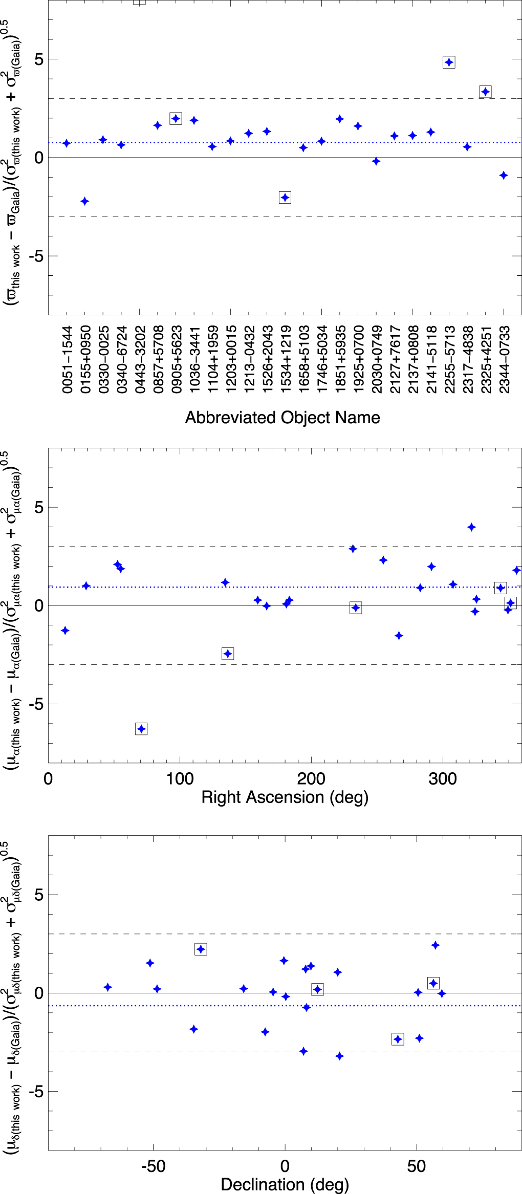 Comparison of the astrometric results from this paper to those presented in Gaia DR2 for the 25 objects (blue stars) in common. Mean offsets along the y-axis are shown by the dotted blue line; dashed black lines show 3σ excursions. Objects with ﹩{\chi }_{\nu }^{2}﹩ values of 1.5 or greater are marked by squares and are not included in the computation of the mean.